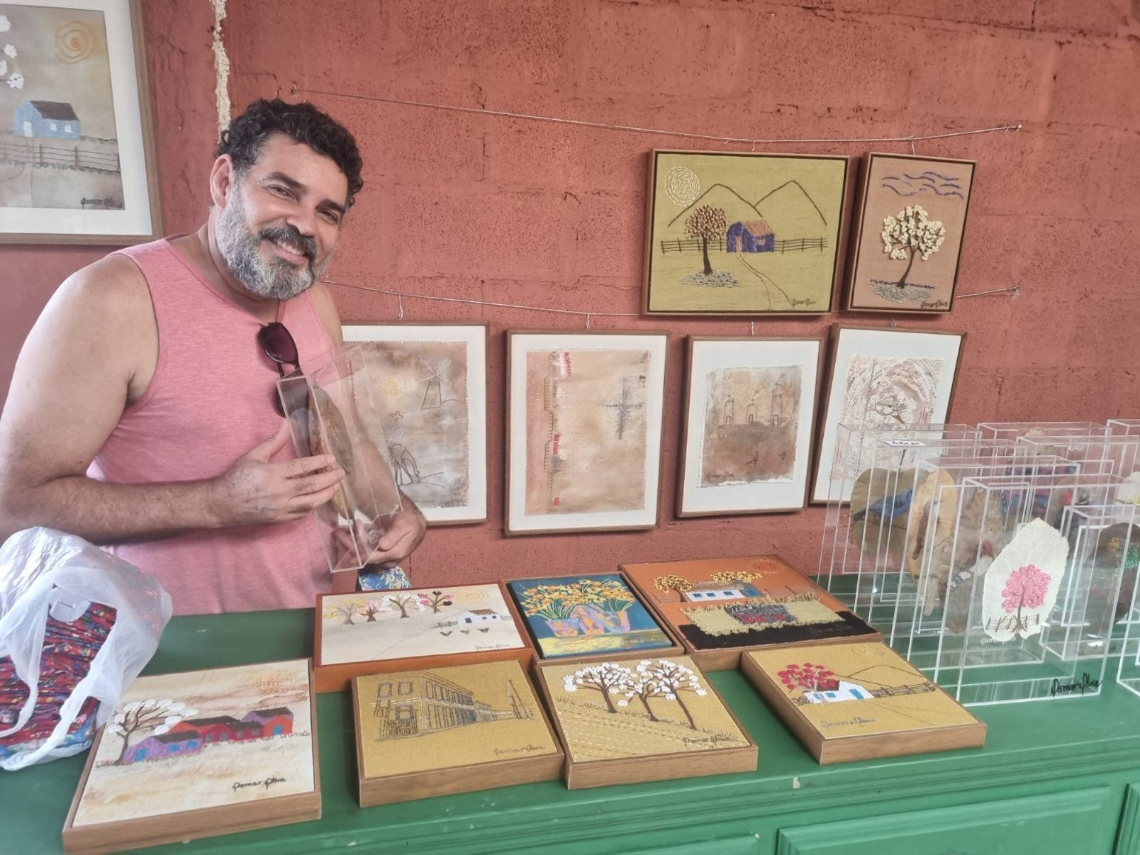 Os trabalhos de Osmar Oliva são um dos destaques da feira. O artista plástico cria quadros com bordados em tecidos reciclados. “Fiz os bordados em tecidos doados por costureiras e tecelãs do Vale do Jequitinhonha”, explica.