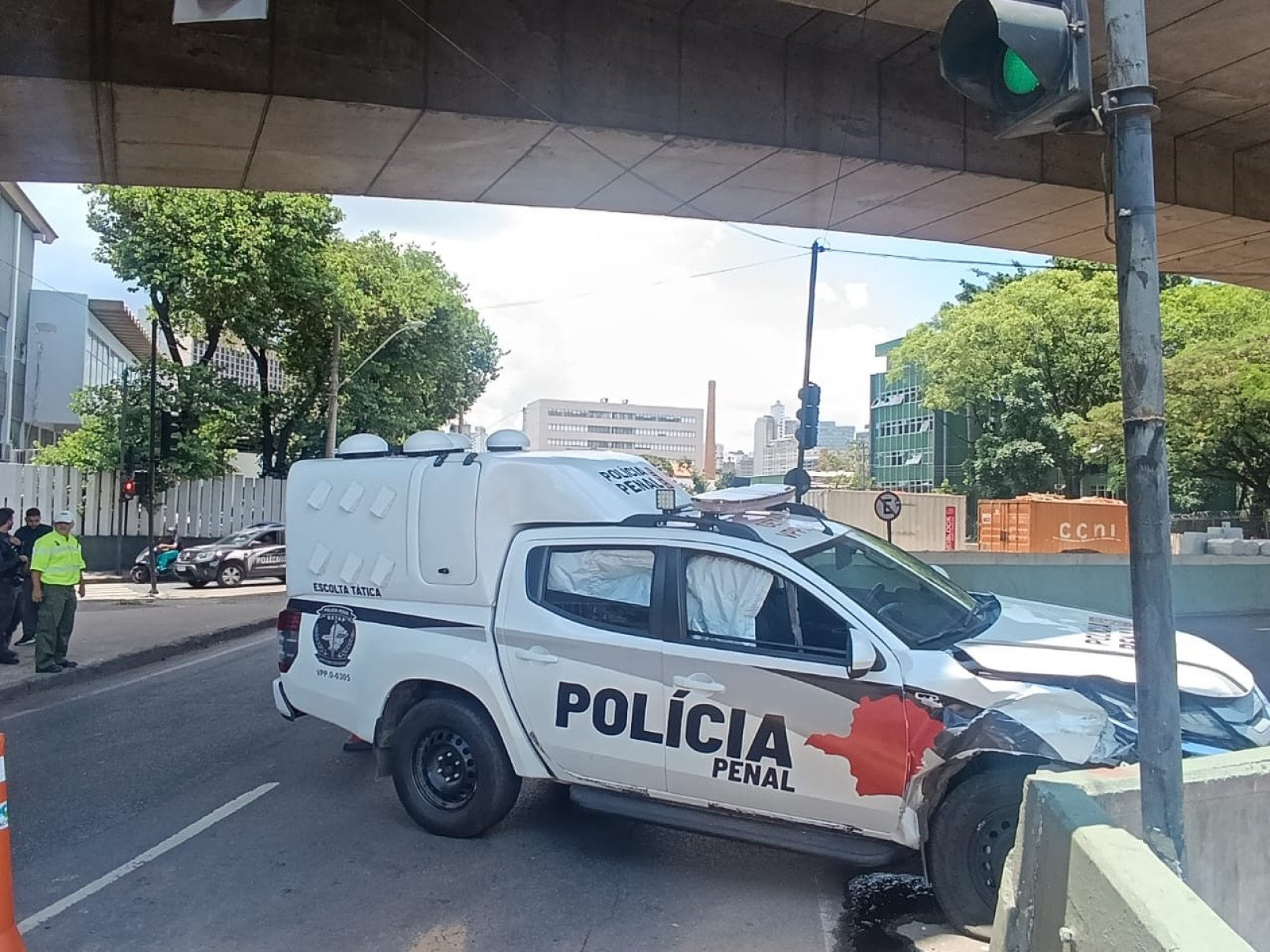 Um acidente envolvendo uma viatura da Polícia Penal e uma Range Rover preta complicou o trânsito na Avenida dos Andradas, sob o viaduto Francisco Sales, no Bairro Santa Efigênia, Região Centro-Sul de Belo Horizonte, na manhã desta terça-feira (30/12).