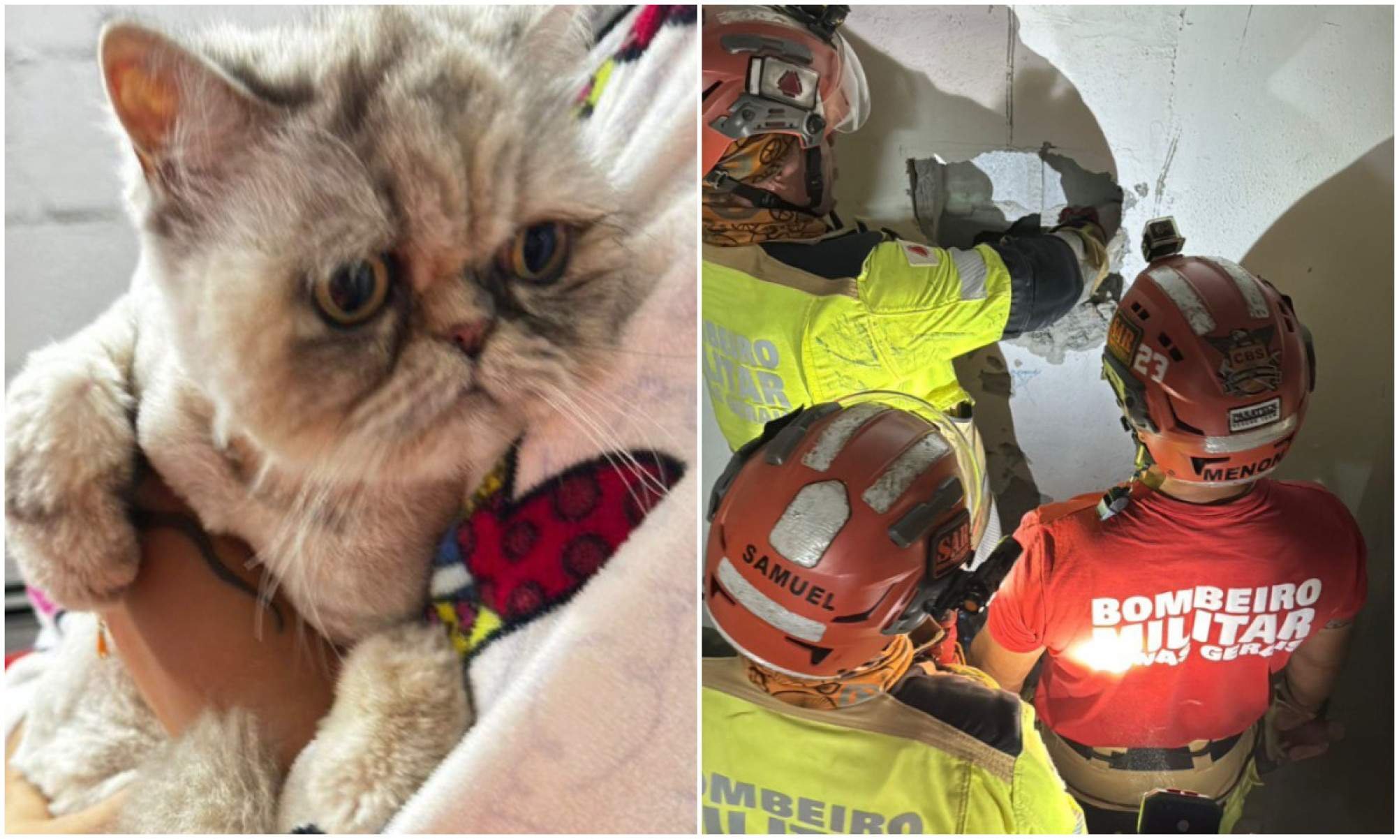 Após uma avaliação técnica, os militares tiveram que quebrar uma parede de alvenaria do fosso do elevador do condomínio. A intervenção na estrutura precisou do consentimento da tutora da gata e do síndico do local.
