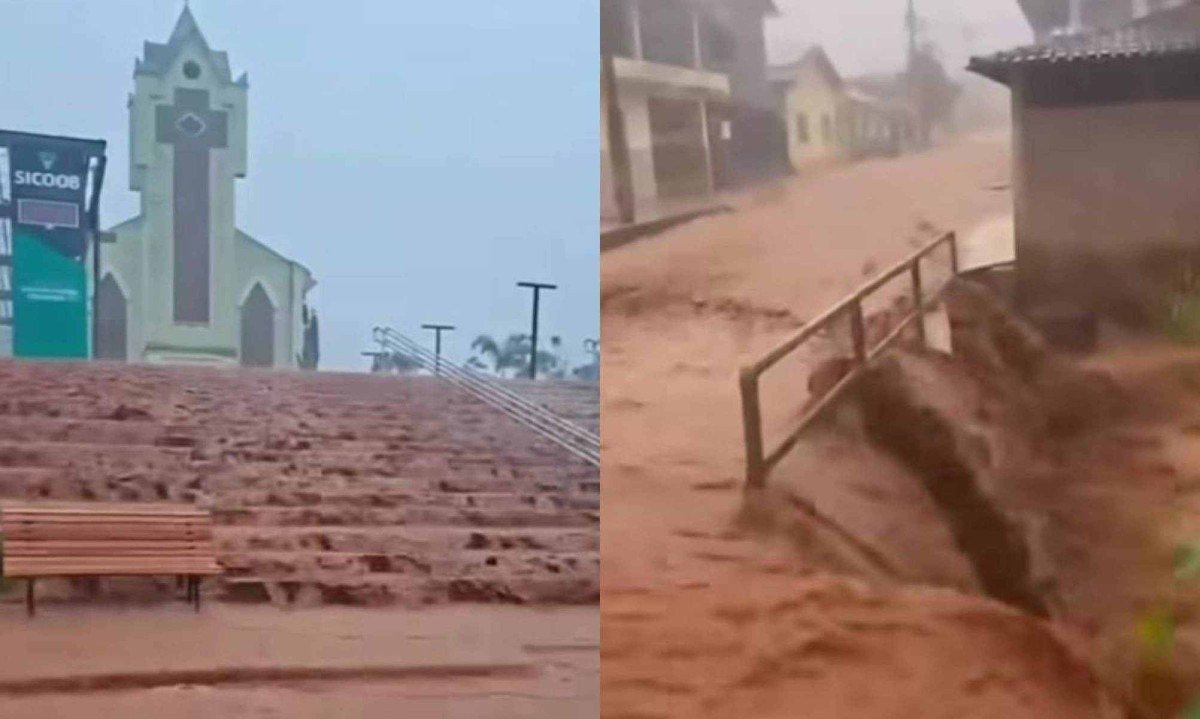 Em vídeos publicados por internautas, é possível observar a escadaria da Paróquia São Pedro, localizada na Praça São Pedro, no Centro da cidade, inundada pela chuva. Nas imagens, a água barrenta corre com força até a rua.