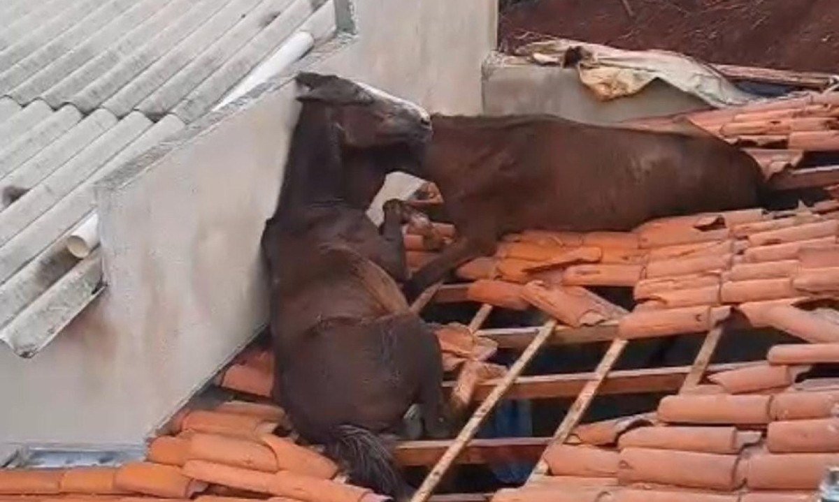 Em vídeo registrado pelo Corpo de Bombeiros, os dois cavalos aparecem deitados nas telhas quebradas.