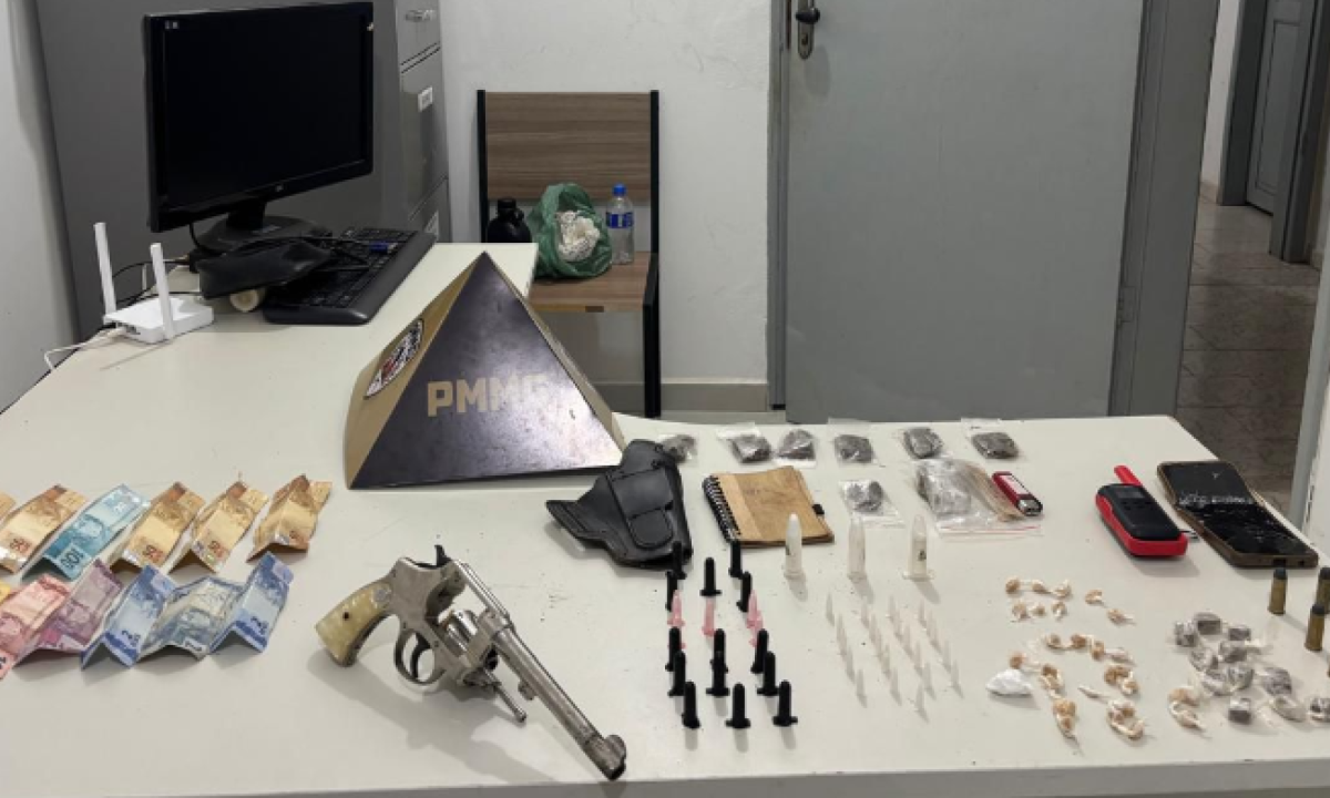 Durante a operação, os militares avistaram o suspeito tentando fugir com uma bolsa preta. Ele foi alcançado e abordado em uma área de pastagem. Com ele, os policiais encontraram uma arma de fogo calibre .44, municiada com seis cartuchos intactos, além de uma grande quantidade de drogas, materiais utilizados para o tráfico e um telefone celular.