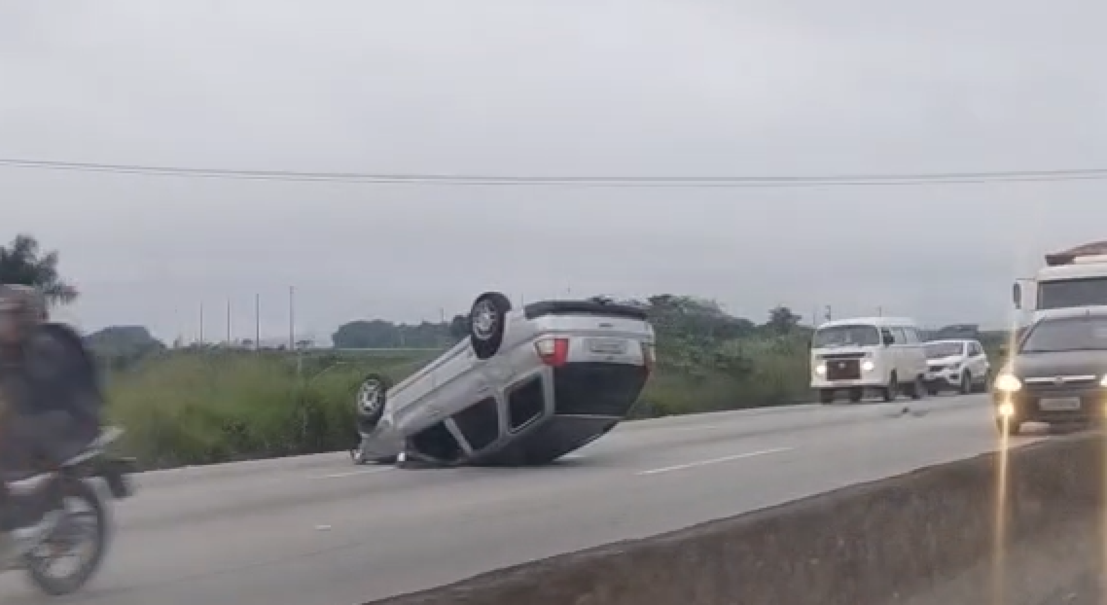 Vídeos que circulam nas redes sociais mostram o veículo de cor prata capotado, com as rodas para cima, ocupando parte da pista.