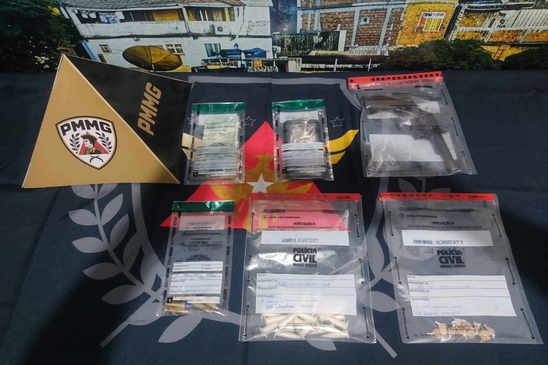 Nas buscas realizadas no imóvel, foi localizado um revólver calibre 38 municiado, além de uma quantidade significativa de cocaína e crack.