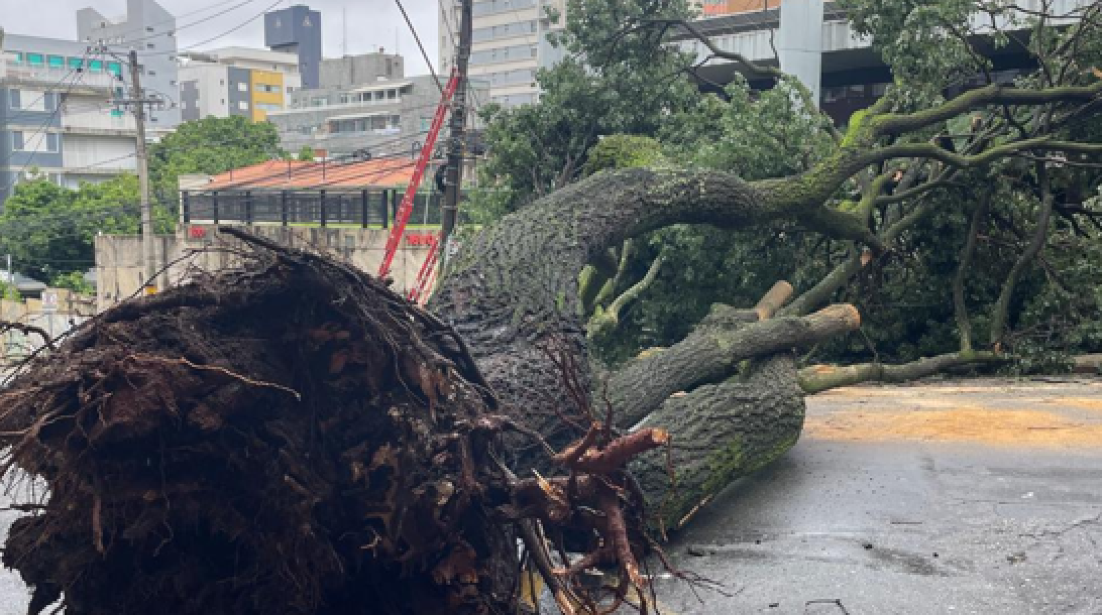 Uma árvore de grande porte caiu e interditou a Rua Bernardo Guimarães, na altura do número 1581, no Bairro Lourdes, Região Centro-Sul de Belo Horizonte (MG). A queda aconteceu na madrugada desta quinta-feira (5/2).