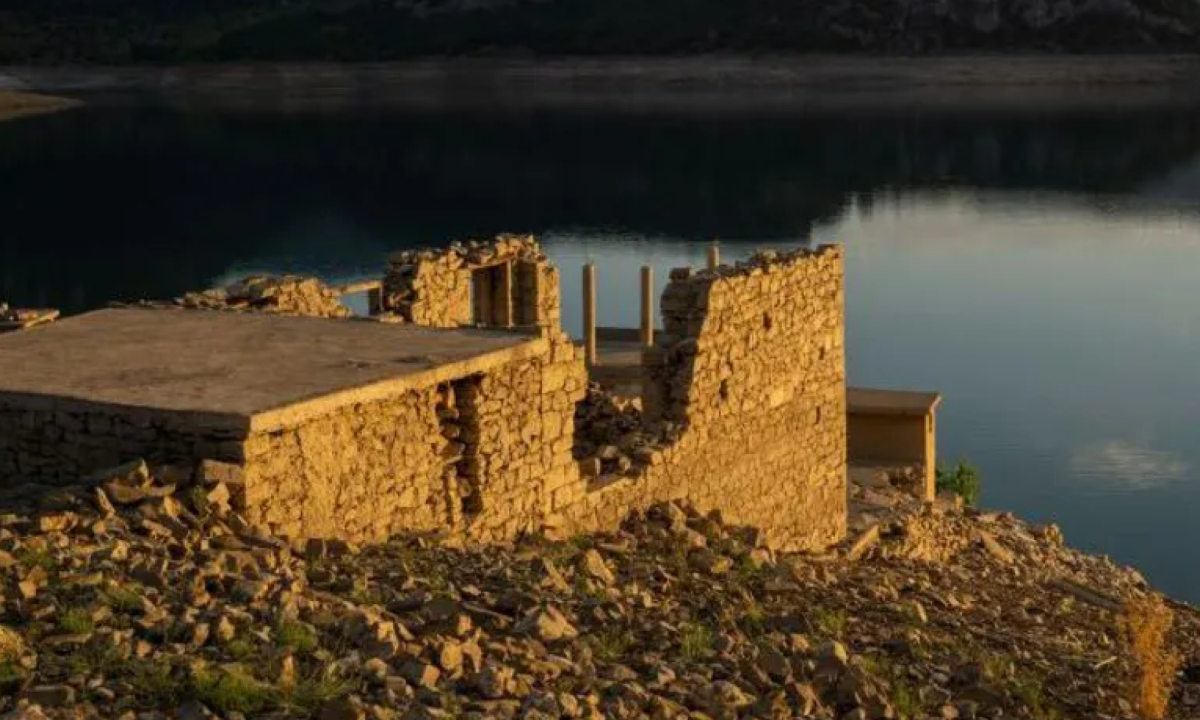 Seca dos últimos meses na Grécia fez com que os níveis de água do reservatório caíssem drasticamente - revelando o que restava de várias casas e de uma escola