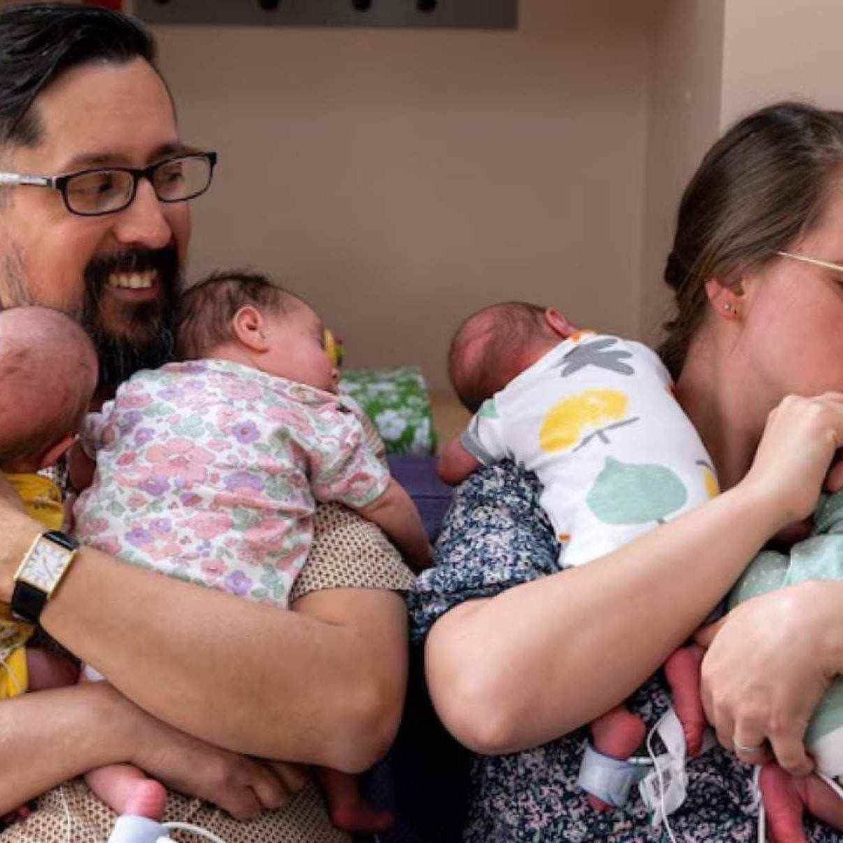 Os novos membros da família já estão em casa; enquanto isso, os pais ainda estão se adaptando à nova rotina. A gravidez quádrupla foi descoberta durante um ultrassom de pré-natal. Rachel, que já tinha dois filhos, estava à espera da terceira criança. Mas então foi surpreendida.