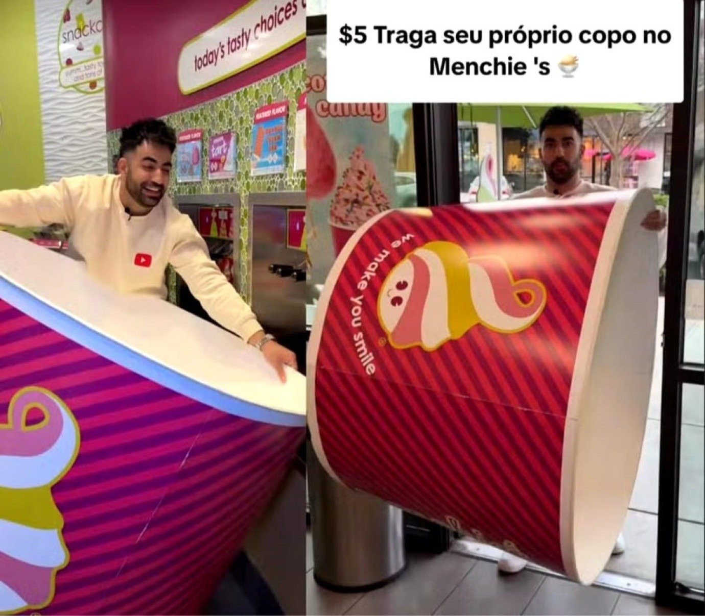 Uma promoção da rede norte-americana de frozen yogurt, Menchie’s, causou um alvoroço nas redes sociais após o influenciador Amin Shaykho, testar seus limites de forma inusitada no dia 25 de março. A oferta, chamada "Traga seu próprio copo", permitia que os consumidores preenchessem seus recipientes com a sobremesa por um valor fixo de US$ 5 (aproximadamente R$ 28,56). No entanto, o rapaz decidiu levar um copo extra grande, o que gerou risos, mas também reflexões sobre as consequências de sua atitude.