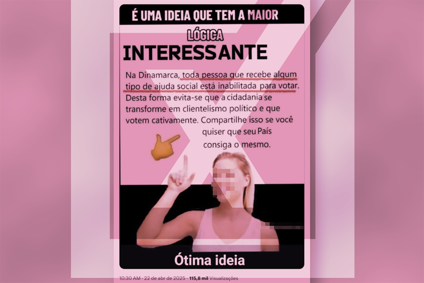 É enganoso o post que afirma que as pessoas que recebem algum tipo de assistência social na Dinamarca ficam impedidas de votar. A publicação que viralizou no X menciona legislação antiga para desinformar. O dispositivo conhecido como “Ajuda aos Pobres” foi anulado em 1961.