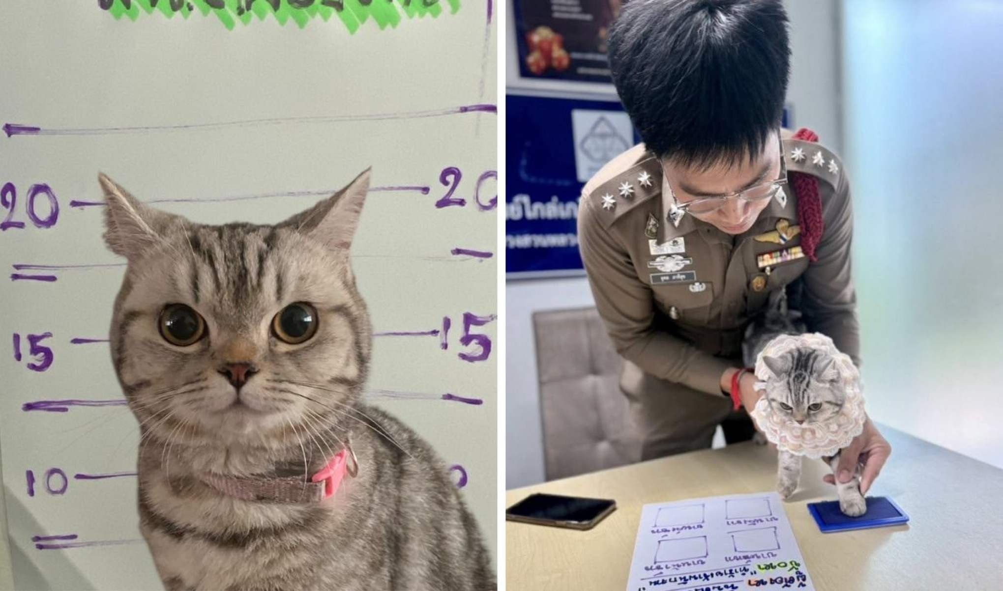 No entanto, a felina da raça American Shorthair, que usava um peitoral rosa, arranhou e mordeu os policiais em serviço, revelando sua personalidade única. Com bom humor, o policial Da Parinda Pakeesuk compartilhou fotos da bandida sendo fichada e tendo as digitais recolhidas.