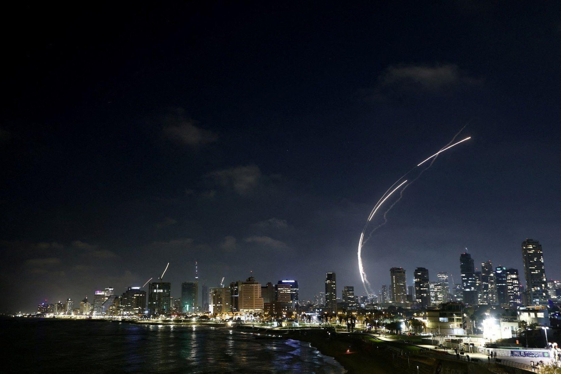 Fotos noturnas em Tel Aviv, Israel, mostram mísseis interceptados, provavelmente pelo sistema de defesa antimísseis israelense, o Domo de Ferro.