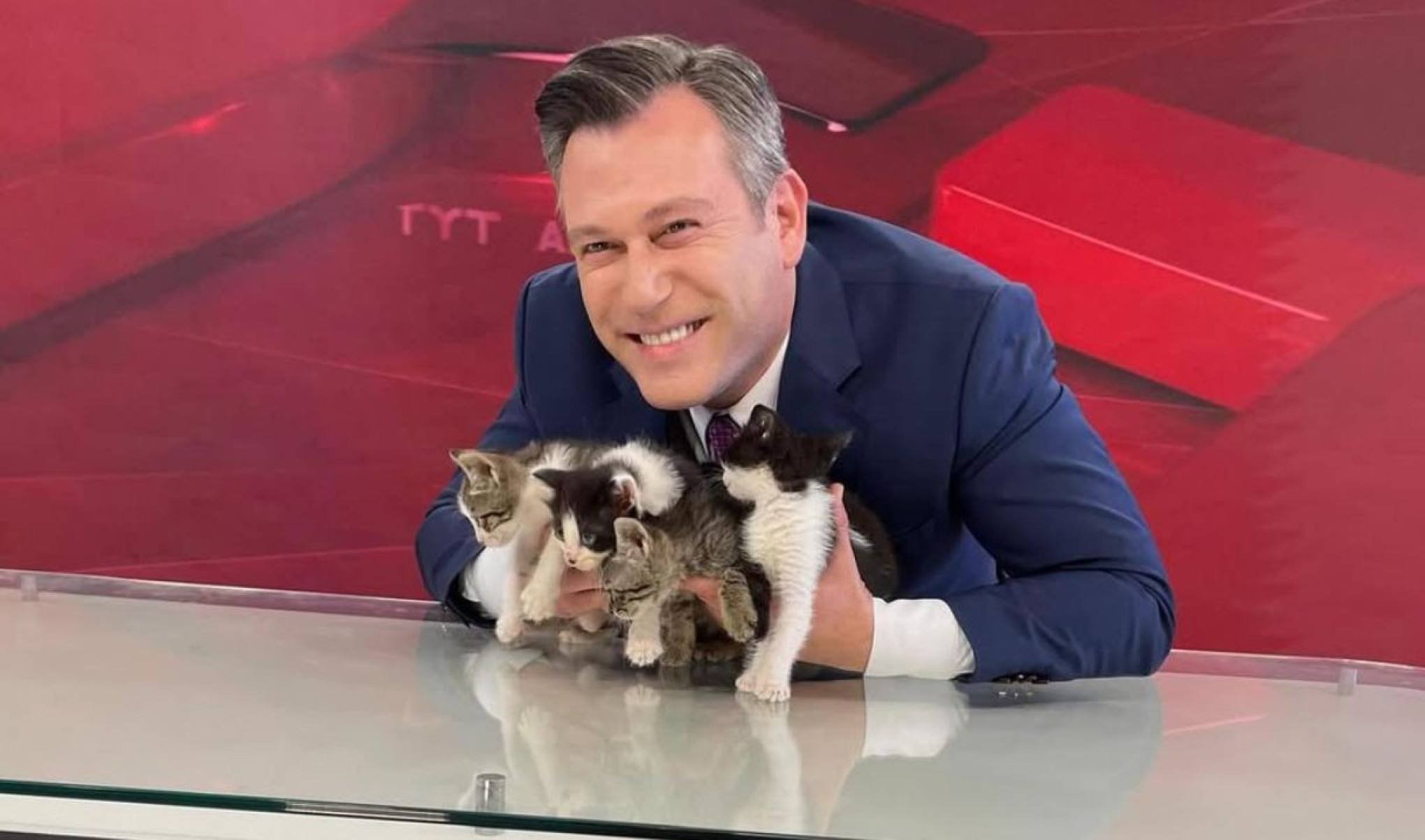 Apresentador Emre Buga com os filhotes de gato durante telejornal - (crédito: TYT Türk)
