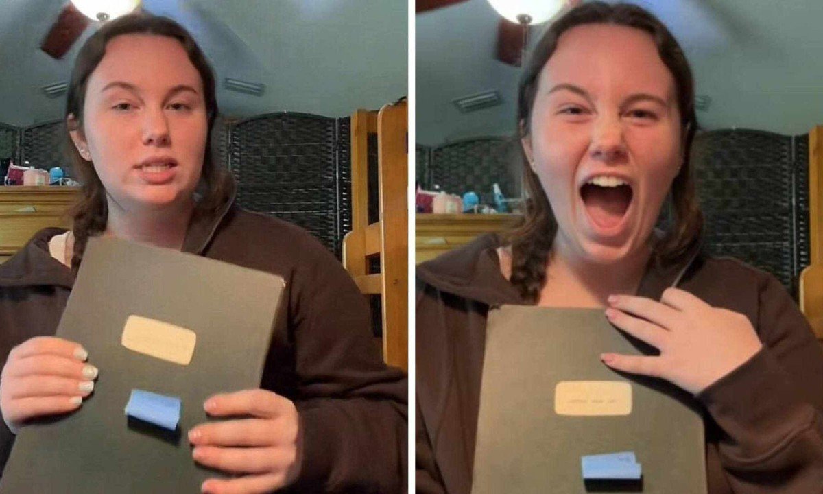 Uma cena comovente viralizou nas redes sociais dos Estados Unidos. Nela, Kaylee mostra uma bolsa floral vintage à venda por US$ 5,99 (R$ 36). Contudo, em seu interior havia um bilhete escrito à mão, que chamou a atenção e trouxe à tona histórias curiosas. Reprodução de Rede Social