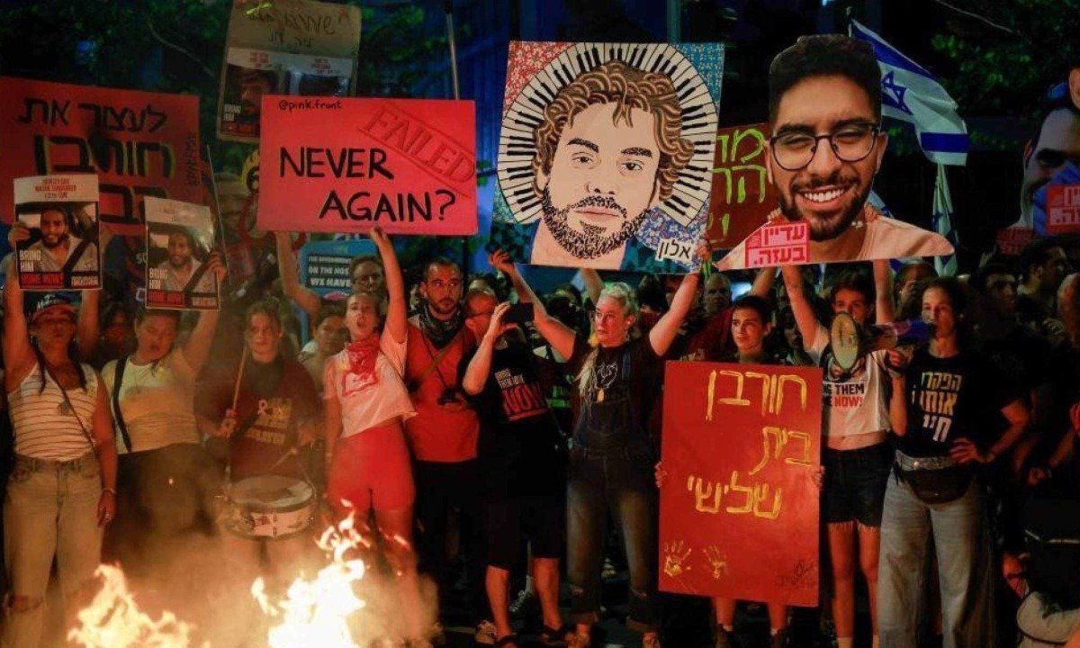 No fim de semana em Tel Aviv, multidões de manifestantes e famílias de reféns se reuniram novamente, pedindo ao governo israelense que garantisse a libertação dos reféns.