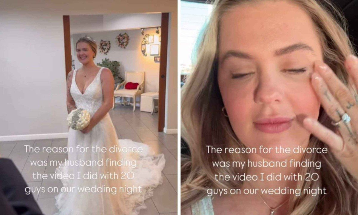 “O motivo do divórcio foi meu marido ter encontrado o vídeo que fiz com 20 homens na nossa noite de núpcias”, escreveu Tiffany. No vídeo, que ela legendou como “A coisa mais difícil pela qual já passei”, a influenciadora aparece vestida de noiva, chorando dentro de um carro, enquanto imagens mostram um grupo de homens subindo uma escada, filmados apenas da cintura para baixo.
