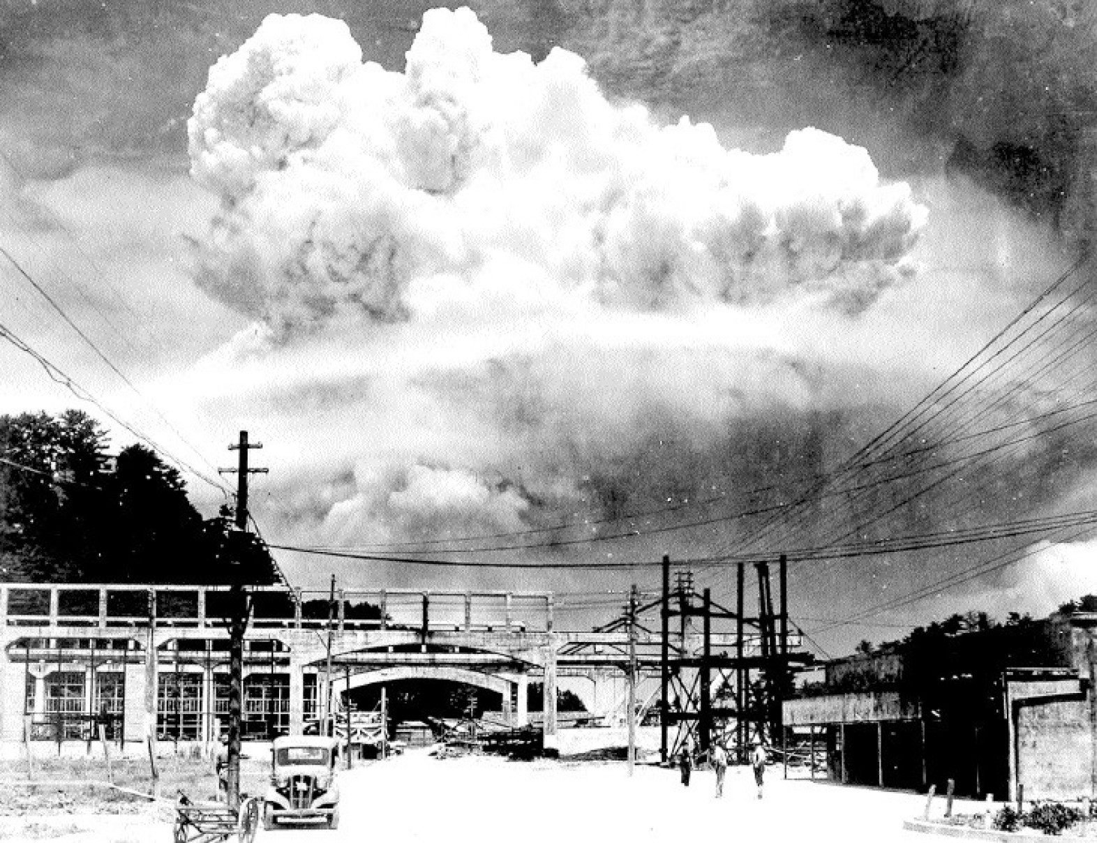O bombardeio nuclear em Nagasaki: foto tirada 15 minutos depois do lançamento da bomba e A Catedral Católica de Urakami reduzida a escombros