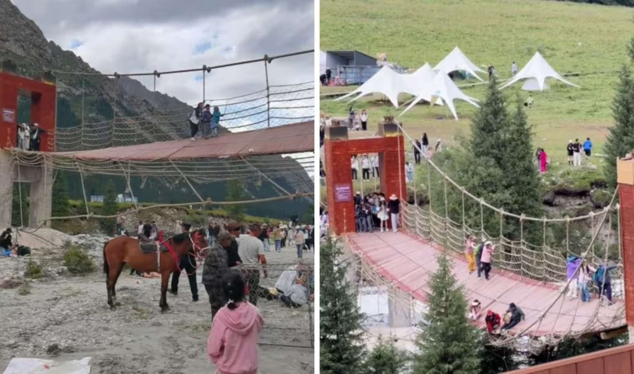 Vídeos que circulam nas redes sociais mostram cenas dramáticas do momento do acidente. Nas imagens, a ponte aparece com os cabos de um lado soltos e pendendo em direção ao chão. Parte da estrutura permanece suspensa sobre um rio. Em um dos vídeos, turistas agarram-se ao lado intacto da ponte, tentando escapar. Outros registros mostram feridos deitados entre pedras, sendo resgatados em macas improvisadas.