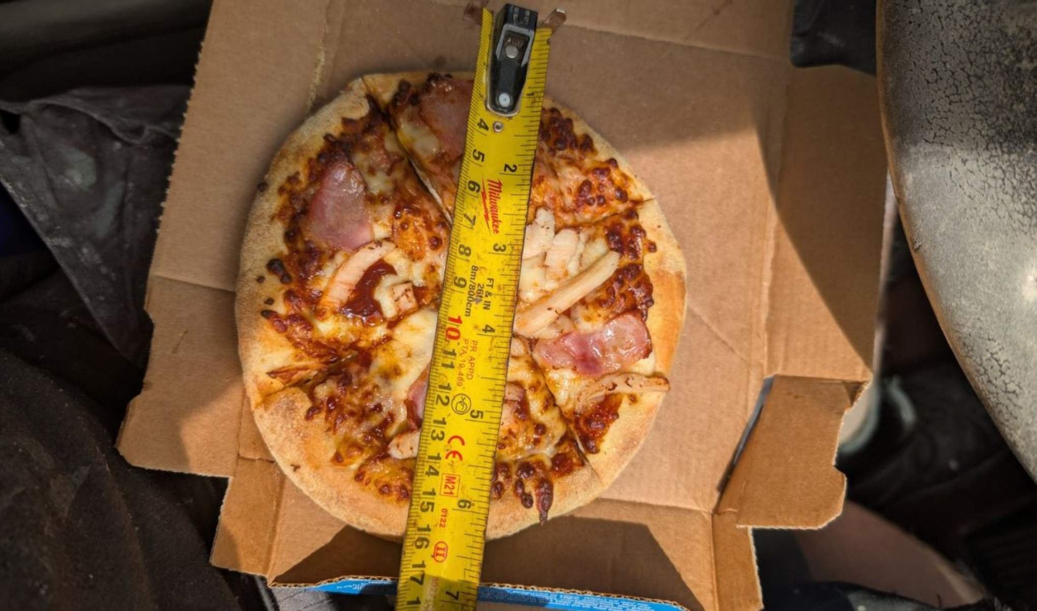 “Faltava mais de uma polegada (2,5 centímetros)”, afirmou. Para confirmar, o cliente decidiu medir a pizza. O resultado? Apenas 16,5 centímetros de um lado e 12,5 centímetros do outro.