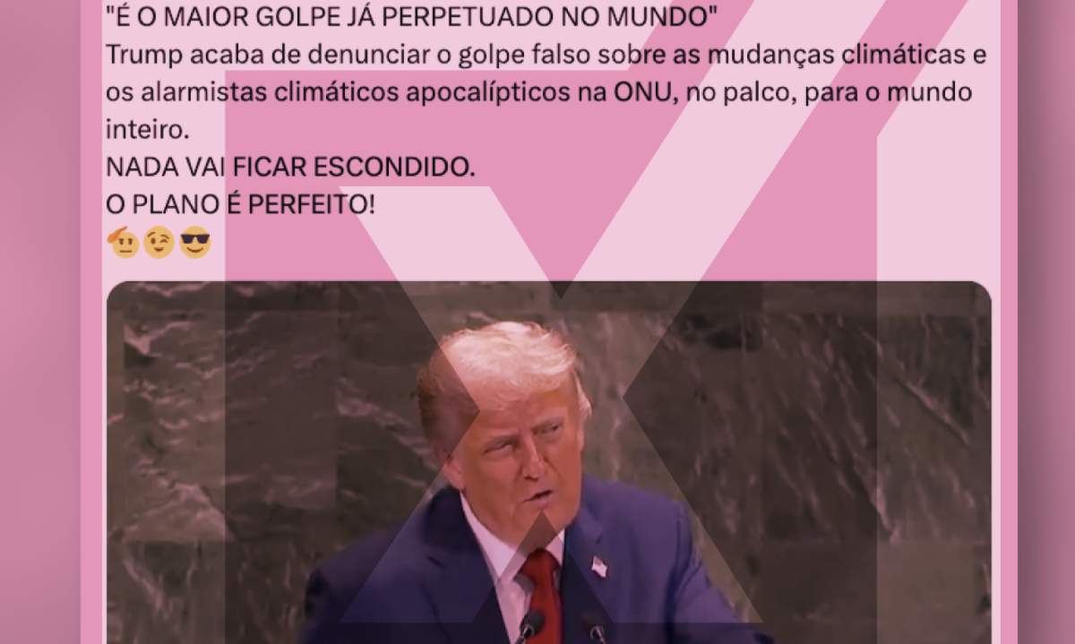 Siga noUm vídeo compartilhado no X repercute trecho do discurso do presidente dos Estados Unidos, Donald Trump, na Assembleia Geral das Nações Unidas (ONU), em que ele afirma que o aquecimento global é um “golpe”. O post, segundo o qual o americano denunciou “o golpe falso sobre as mudanças climáticas”, ignora as evidências sobre o tema. É consenso na comunidade científica que o aquecimento global é uma realidade.
