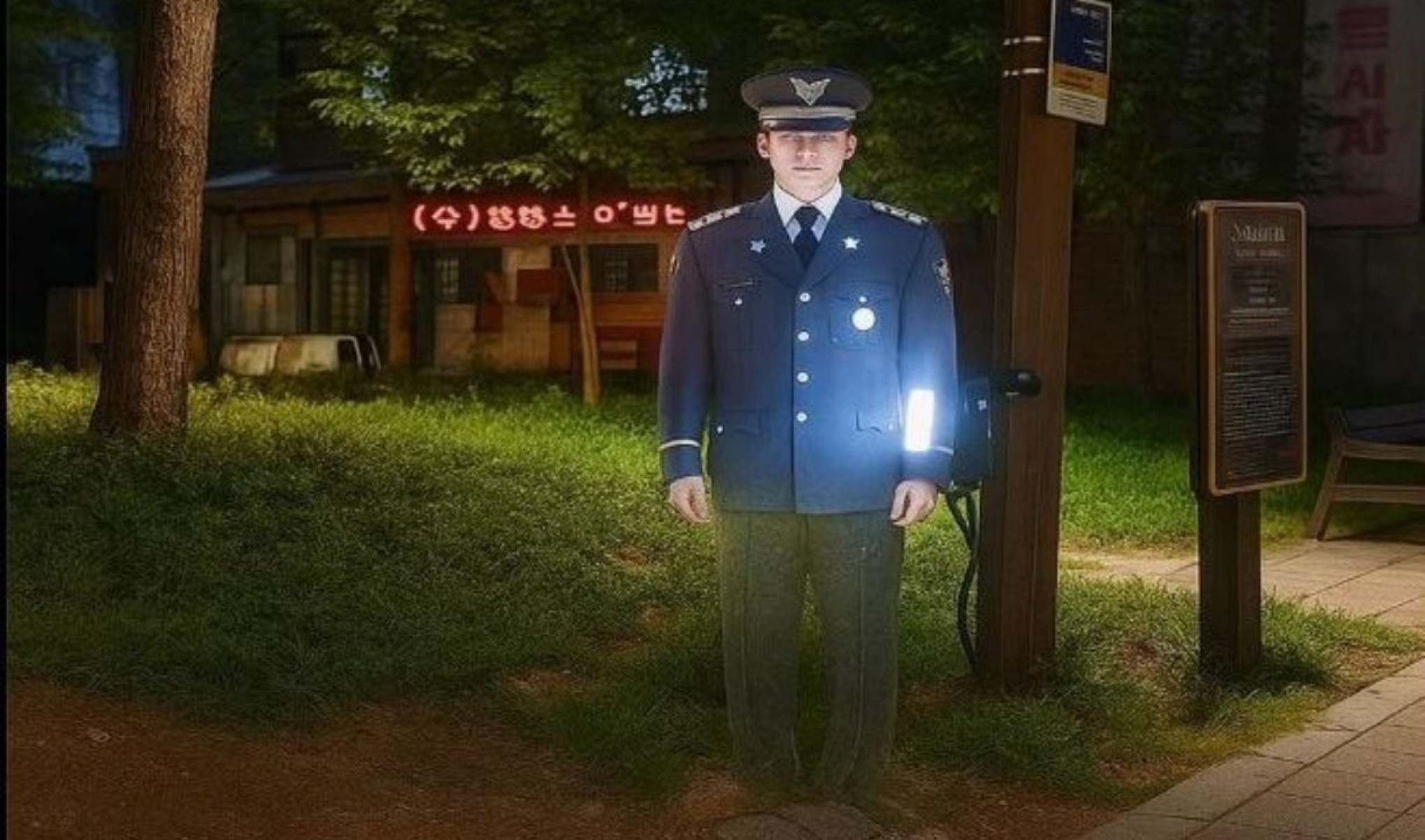 O holograma, desenvolvido pela empresa sul-coreana Hologrammica, mede cerca de 1,7 metro de altura e é uniformizado com traje de gala, escolhido por ser adequado para todas as estações do ano. A projeção 3D é baseada em um policial real e foi implementada no Parque Jodong nº 3, no centro da cidade, como parte do programa “Parque Seguro”, que visa áreas propensas a distúrbios públicos, como embriaguez e comportamento violento.