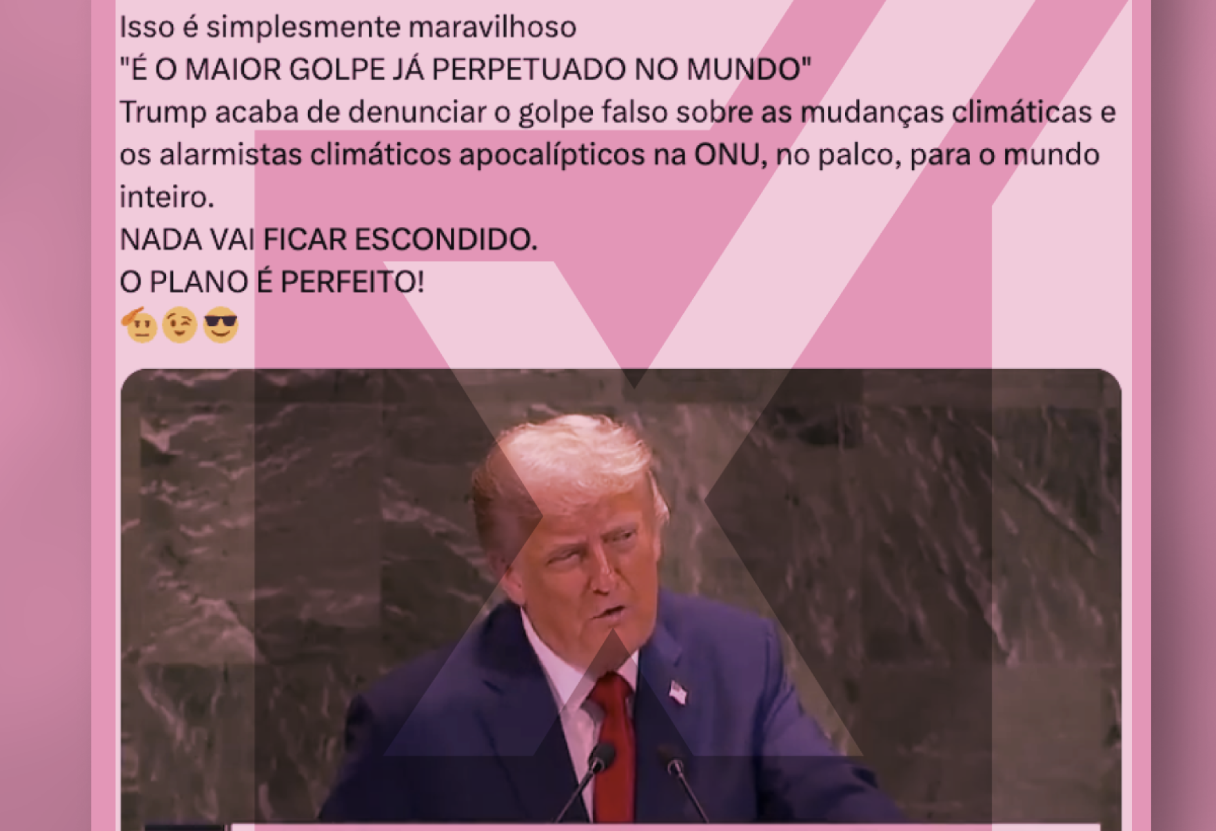 Um vídeo compartilhado no X repercute trecho do discurso do presidente dos Estados Unidos, Donald Trump, na Assembleia Geral das Nações Unidas (ONU), em que ele afirma que o aquecimento global é um “golpe”. O post, segundo o qual o americano denunciou “o golpe falso sobre as mudanças climáticas”, ignora as evidências sobre o tema. É consenso na comunidade científica que o aquecimento global é uma realidade.