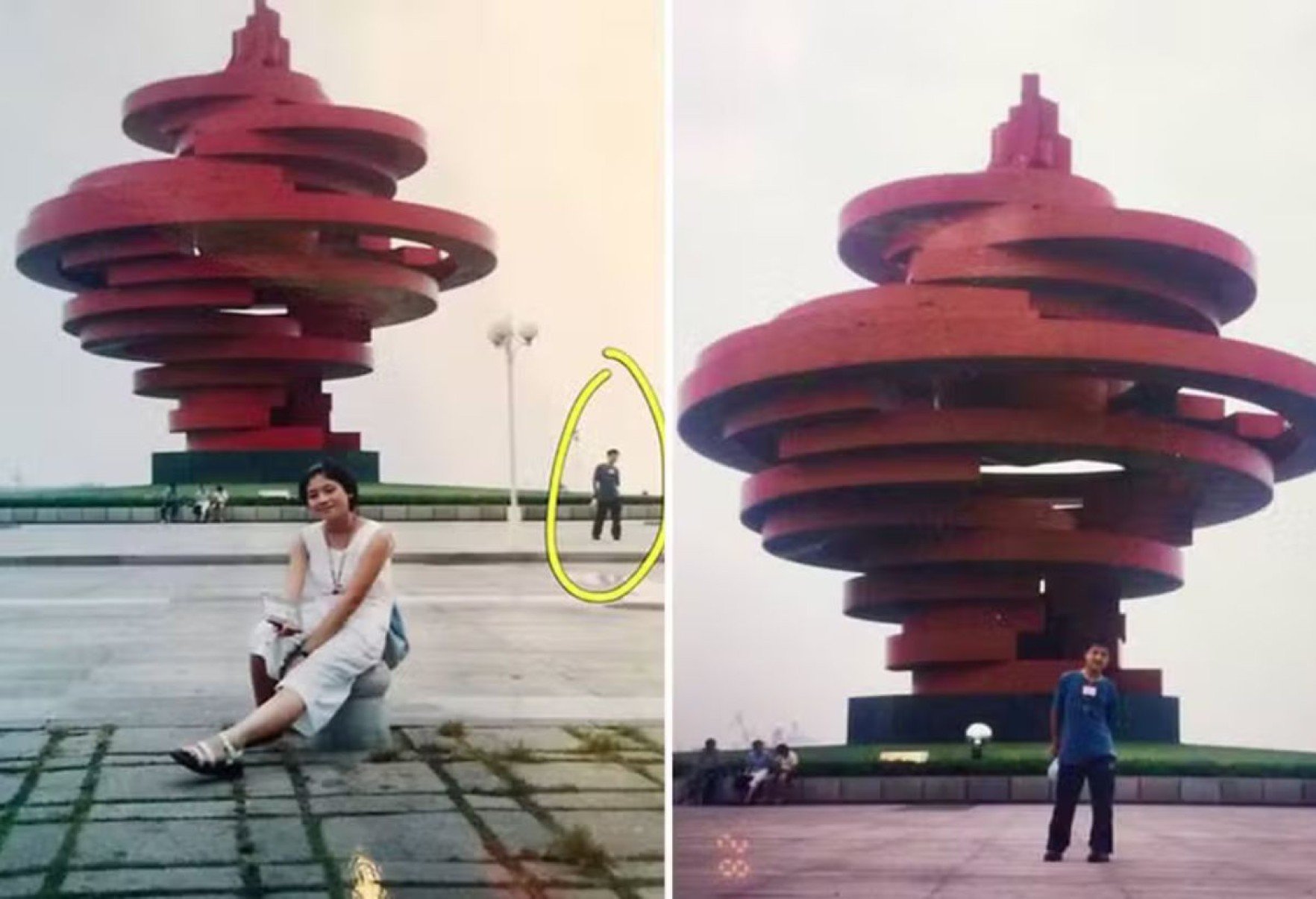 As imagens haviam sido tiradas nos anos 2000, em frente a uma escultura vermelha monumental na cidade de Qingdao. Na ocasião, eles eram apenas dois adolescentes desconhecidos, fotografados por acaso, um atrás do outro, em meio à multidão. Não trocaram palavras, olhares e sequer notaram a presença um do outro.