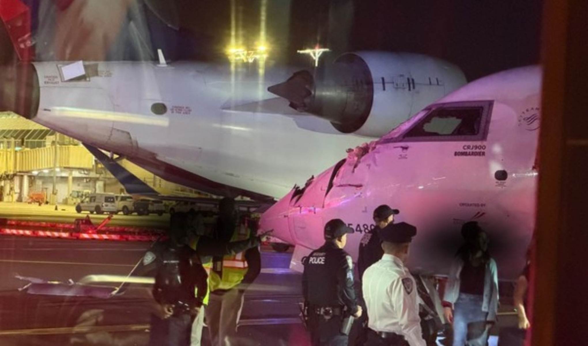 Dois aviões da companhia aérea Delta colidiram durante o procedimento de taxiamento no Aeroporto LaGuardia, em Nova York, na noite desta quarta-feira (1º/10). De acordo com a Autoridade Portuária de Nova York e Nova Jersey, uma comissária de bordo sofreu ferimentos leves e foi levada a um hospital, sem risco de morte. Nenhum passageiro ficou ferido.