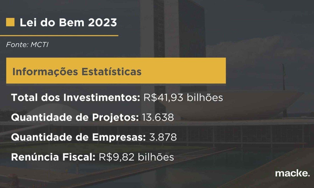 De acordo com os dados disponibilizados pelo Ministério da Ciência, Tecnologia e Inovação (MCTI), a Lei do Bem movimentou R$ 41,93 bilhões em investimentos em 2023, com 13.638 projetos cadastrados por 3.878 empresas. O volume de renúncia fiscal alcançou R$ 9,82 bilhões, evidenciando a dedicação em fortalecer a inovação no setor privado.