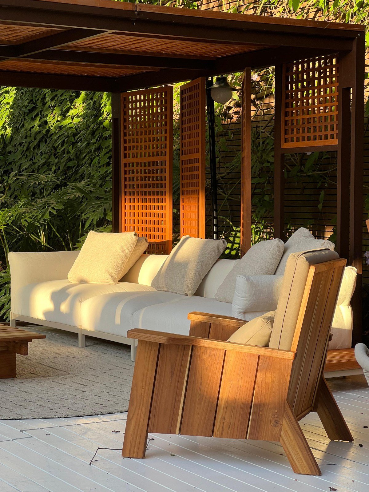 A ambientação proposta pela arquiteta teve como foco a ocupação da varanda do showroom, com um projeto voltado ao uso de áreas externas. A composição reuniu peças da DonaFlor Mobília — como a espreguiçadeira Vela, assinada por Andrea Zanocchi; o sofá da linha Vinco, do estúdio Ninho; o banco Rio, assinado por Janete Costa; e as poltronas Cecília, assinadas por Linda Martins —, além de elementos de paisagismo integrados ao mobiliário.