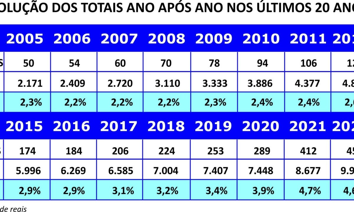Analisando a evolução da presença dos ativos administrados no PIB, nas duas últimas décadas, nota-se crescimento permanente do indicador. Desde 2005, quando a relação era de 2,3% (R$ 50 bilhões sobre R$ 2,171 trilhões), houve crescimento de 165,2% ao chegar em 6,1% de participação (R$ 719,0 bilhões sobre R$ 11,7 trilhões) em 2024.
