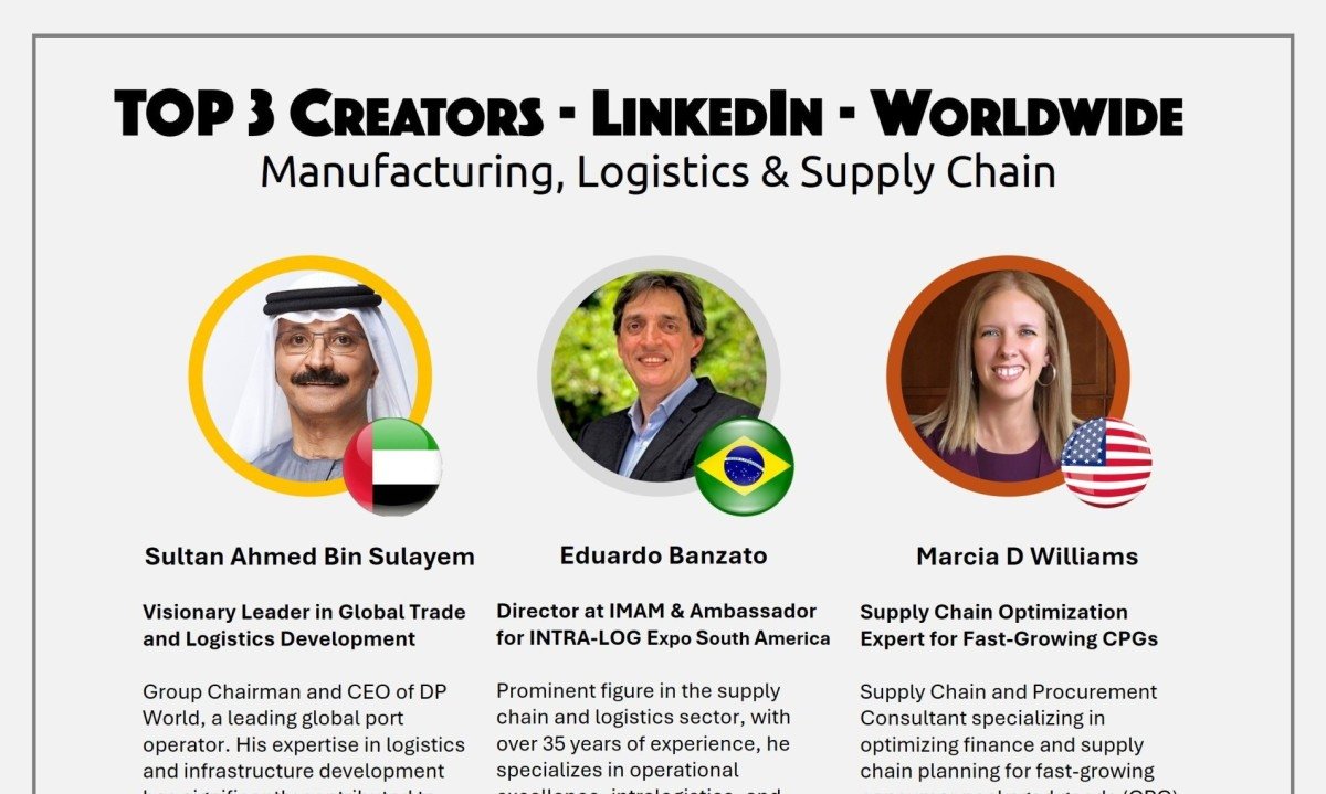 A plataforma Favikon é dinâmica e altera os TOP 3 continuamente e a composição do ranking em 06 de agosto, destacando os 3 maiores “influencers” mundiais no LinkedIn. No setor de “Manufacturing, Logistics & Supply Chain” foram: Sultan Ahmed Bin Sulayem (CEO da DP World – EAU), Eduardo Banzato (Diretor do IMAM - Supply Chain, Logística e Intralogística - Brasil) e Marcia D Williams (Especialista em Supply Chain - EUA).