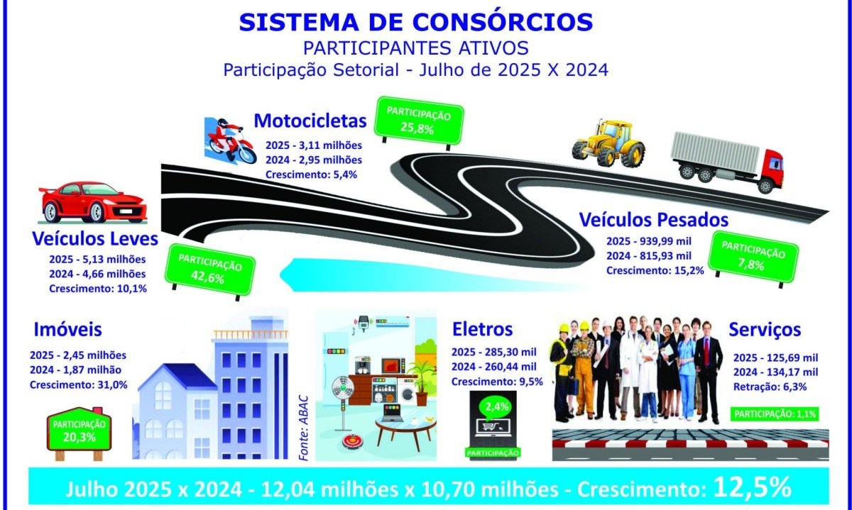 Nos 12,04 milhões de consorciados ativos, cada setor apresentou os seguintes volumes: 5,13 milhões em veículos leves; 3,11 milhões em motocicletas; 2,45 milhões em imóveis; 939,99 mil em veículos pesados; 285,30 mil em eletroeletrônicos e outros bens móveis duráveis; e 125,69 mil em serviços.