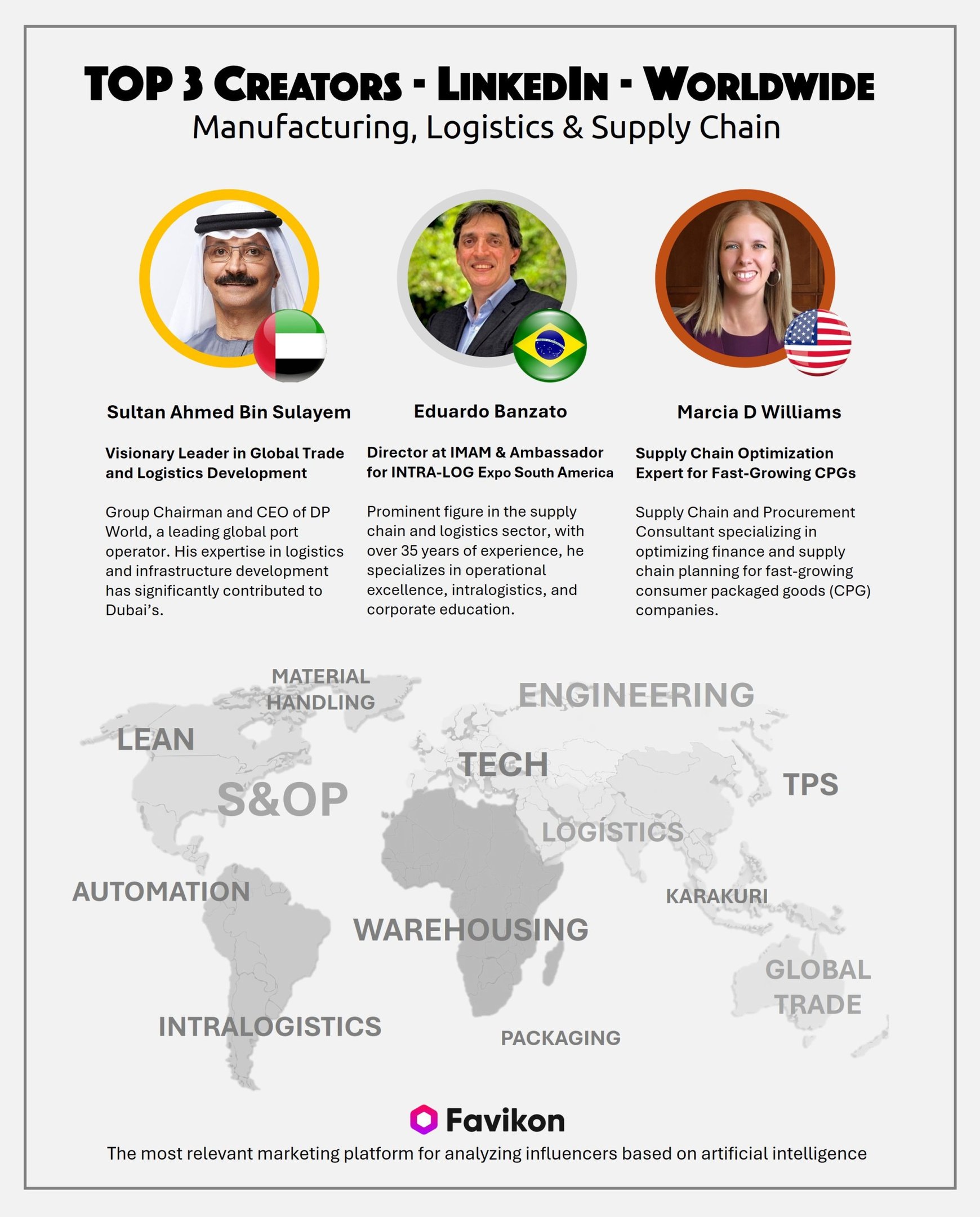 A plataforma Favikon é dinâmica e altera os TOP 3 continuamente e a composição do ranking em 06 de agosto, destacando os 3 maiores “influencers” mundiais no LinkedIn. No setor de “Manufacturing, Logistics & Supply Chain” foram: Sultan Ahmed Bin Sulayem (CEO da DP World – EAU), Eduardo Banzato (Diretor do IMAM - Supply Chain, Logística e Intralogística - Brasil) e Marcia D Williams (Especialista em Supply Chain - EUA).