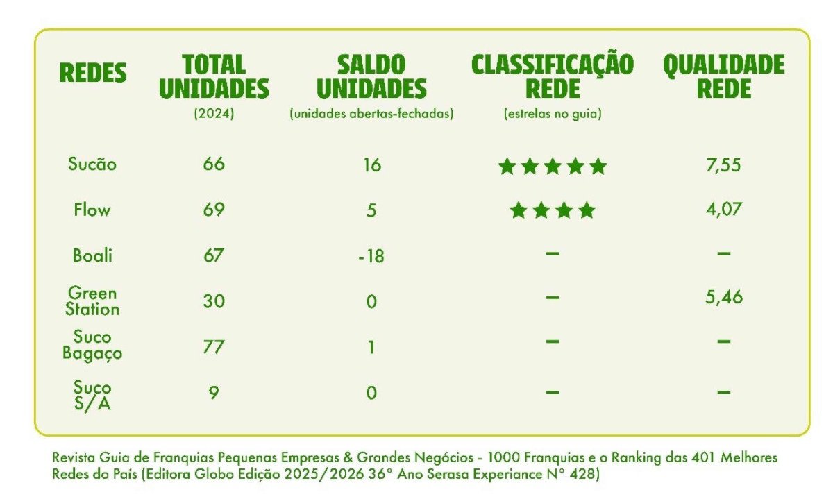 Esse movimento foi evidenciado na última edição da premiação As Melhores Franquias do Brasil 2025, promovida pela revista Pequenas Empresas & Grandes Negócios em parceria com a Serasa Experian. Das 93 redes que conquistaram a nota máxima de cinco estrelas, a Sucão foi um dos destaques na categoria de alimentação saudável. A marca, que atua com foco em produtos naturais e refeições equilibradas, foi a única do segmento a receber essa classificação.