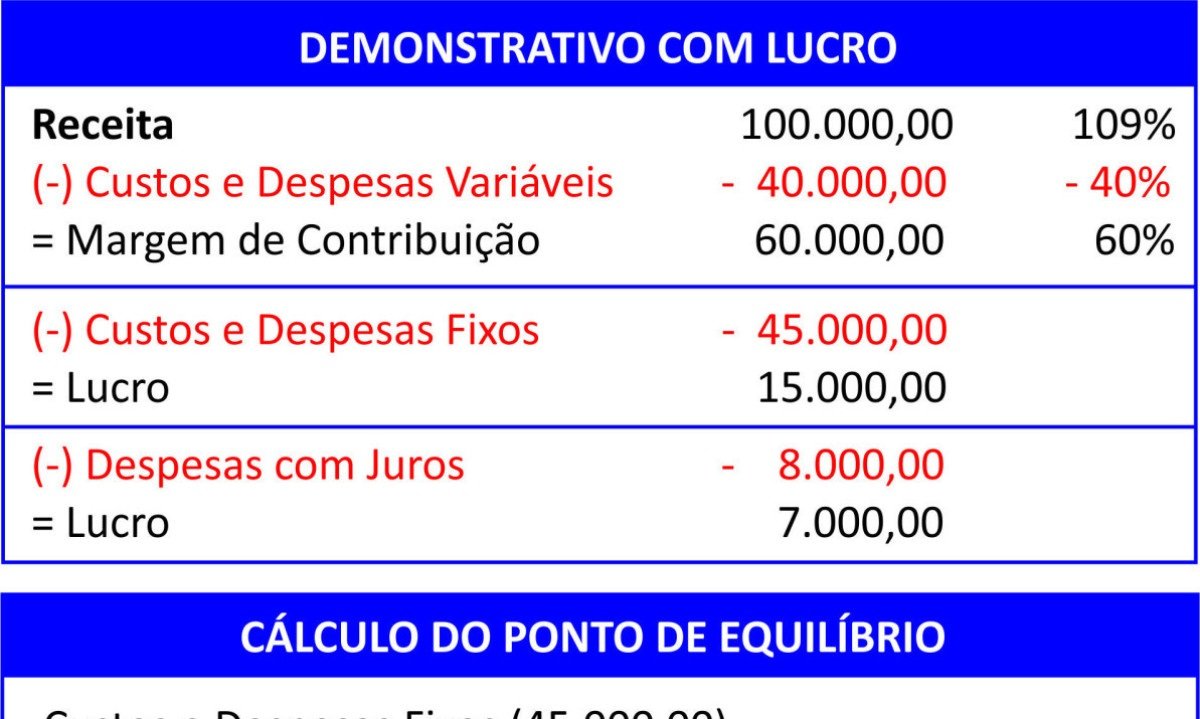 Na demonstração, é possível verificar que, com o valor das vendas em R$ 100.000,00, o empresário terá um lucro operacional de R$ 7.000,00. Caso o faturamento venha a atingir R$ 75.000,00, igualaria as receitas com as despesas, não havendo lucro e nem prejuízo, e resultaria em equilíbrio.