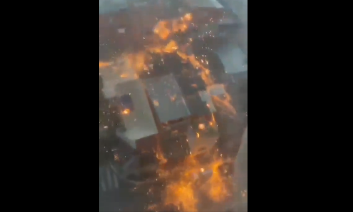 No vídeo é possível ver o raio atingindo o prédio e causando enormes faíscas, que caem nas casas próximas à estrutura, formando um mar de fogo.