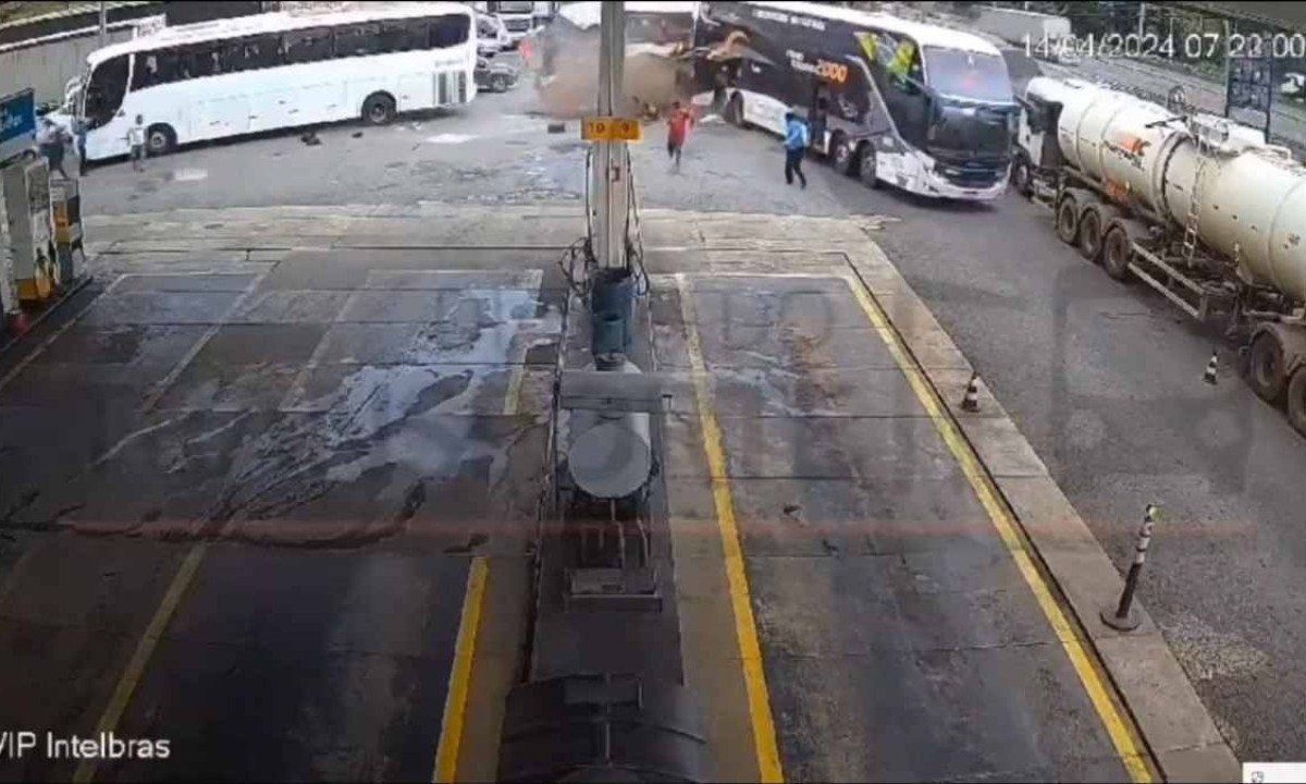 Um vídeo da circuito interno mostra o momento do acidente. Nas imagens, é possível ver que o ônibus invade a área do posto e ainda bate em um caminhão e em outro ônibus.