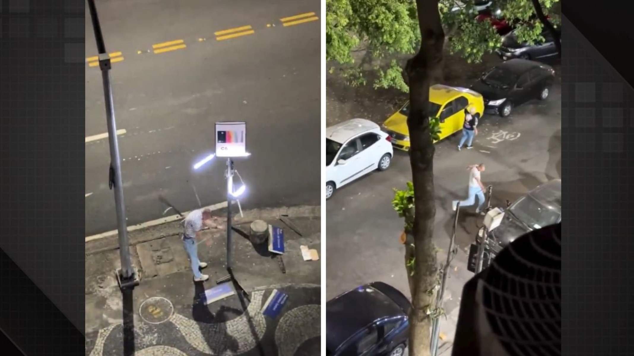 Moradores da região registraram os atos de vandalismo. Em vídeos, o turista aparece chutando carros e motos estacionados, e quebrando retrovisores e vidros. Além disso, ele balança um poste de sinalização até as placas caírem.