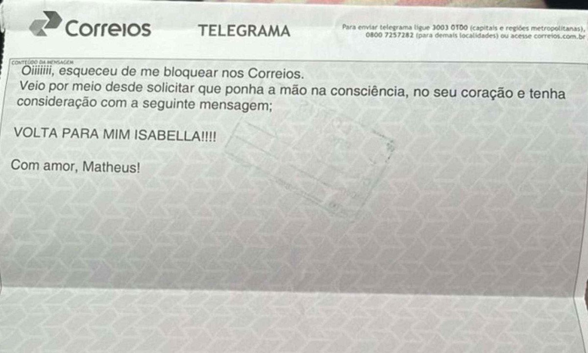 Na publicação, a jovem que se identificou como Isa disse que foi a primeira vez que ela recebeu um telegrama, justo em seu aniversário. “Oiiii, esqueceu de me bloquear nos Correios. Venho por meio deste solicitar que coloque a mão na consciência, no seu coração e tenha consideração com a seguinte mensagem; Volta para mim, Isabella! Com amor, Matheus”, diz o texto.