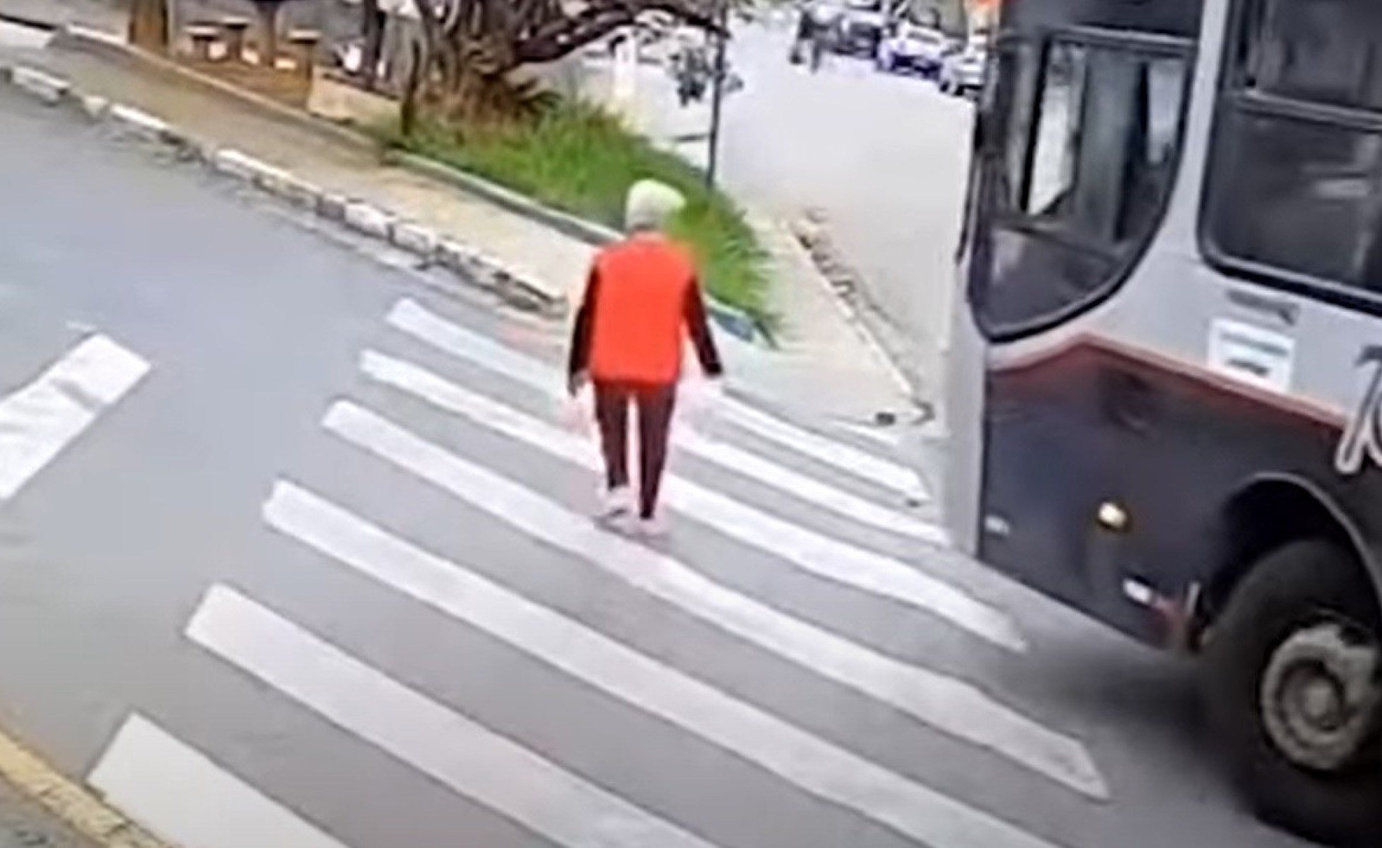 Imagens de câmera de monitoramento mostram quando a mulher sai da padaria e para na calçada, em frente à faixa de pedestres. Ela olha para os lados e espera os carros passarem. Quando está na metade da travessia, um ônibus surge fazendo uma curva e a atropela.