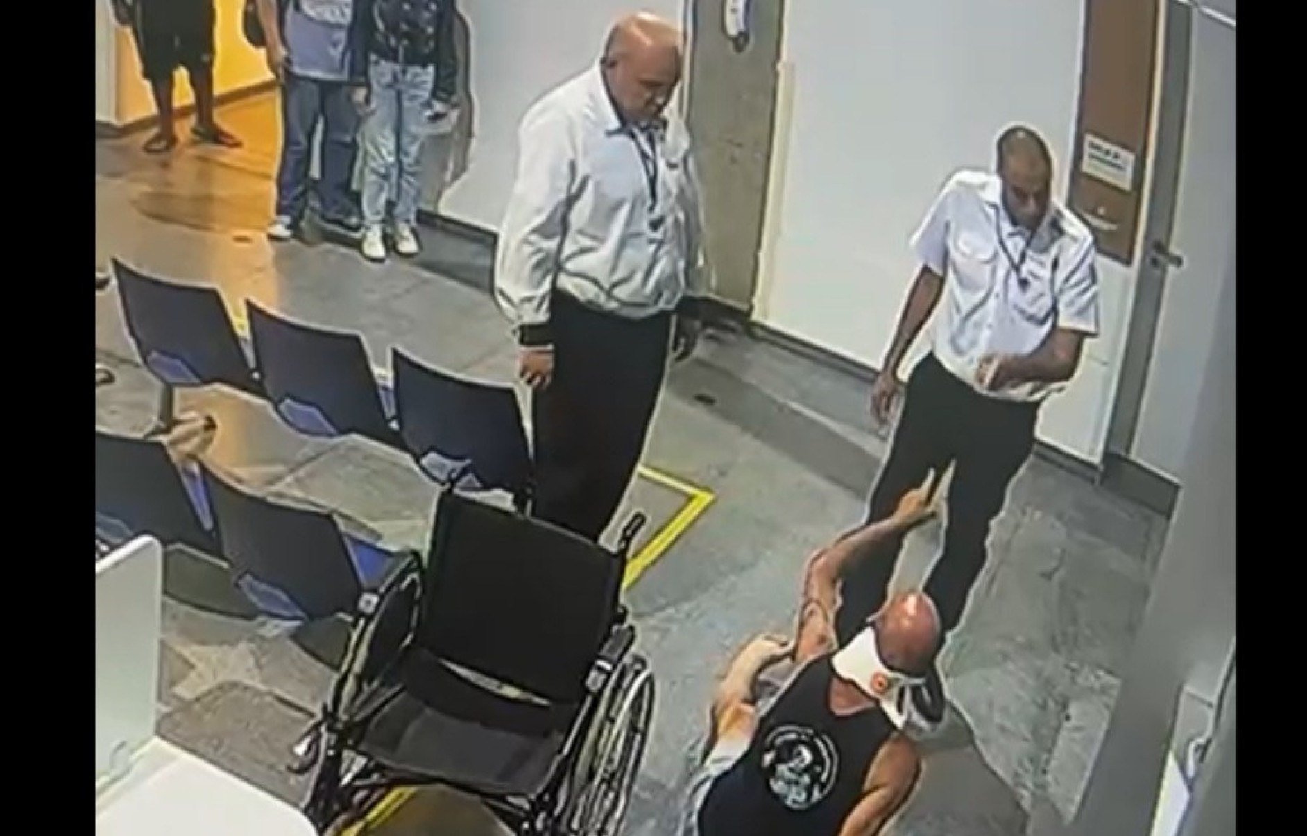 O homem tenta se levantar da cadeira quando é empurrado agressivamente pelo agente. O caso ocorreu às 3h20 desta quarta-feira (21), e foi registrado por câmeras de segurança do local, que mostram dois funcionários fazendo a vigilância no momento. Ele havia acabado de sofrer um acidente de carro e continua internado na manhã desta quinta-feira (22).