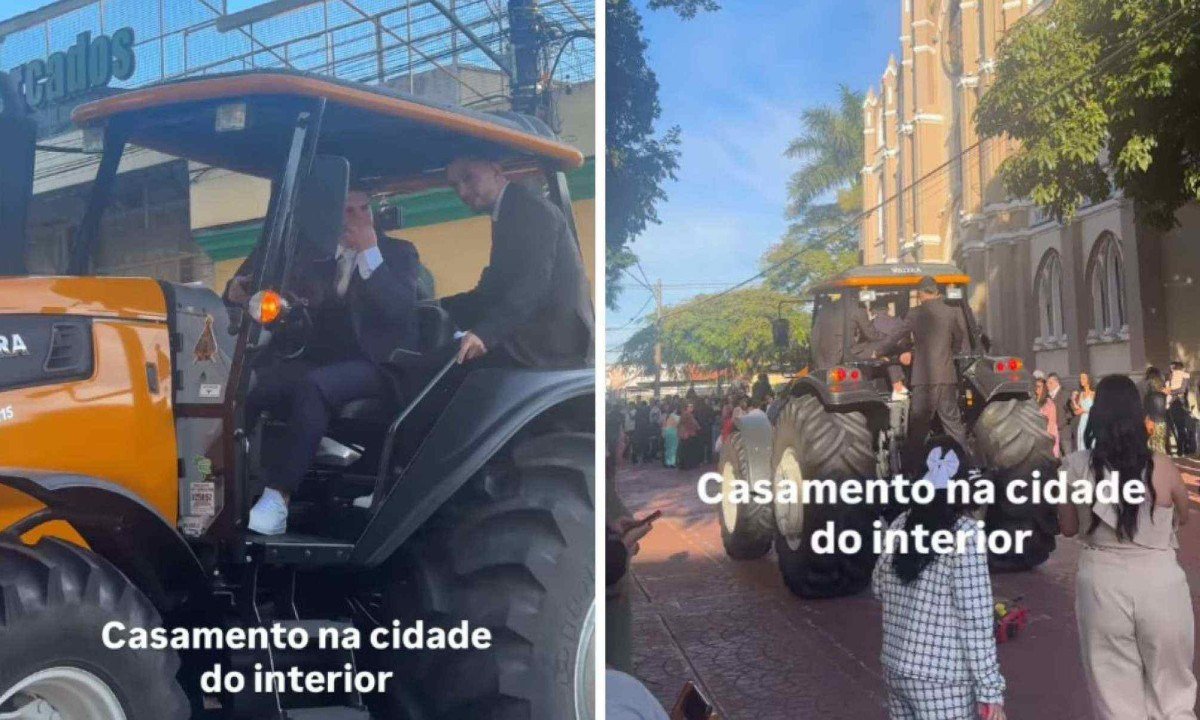 Além de levar o noivo, o trator também transportou os padrinhos até o local da cerimônia. Ao término da celebração, os recém-casados deixaram o local a bordo da máquina.