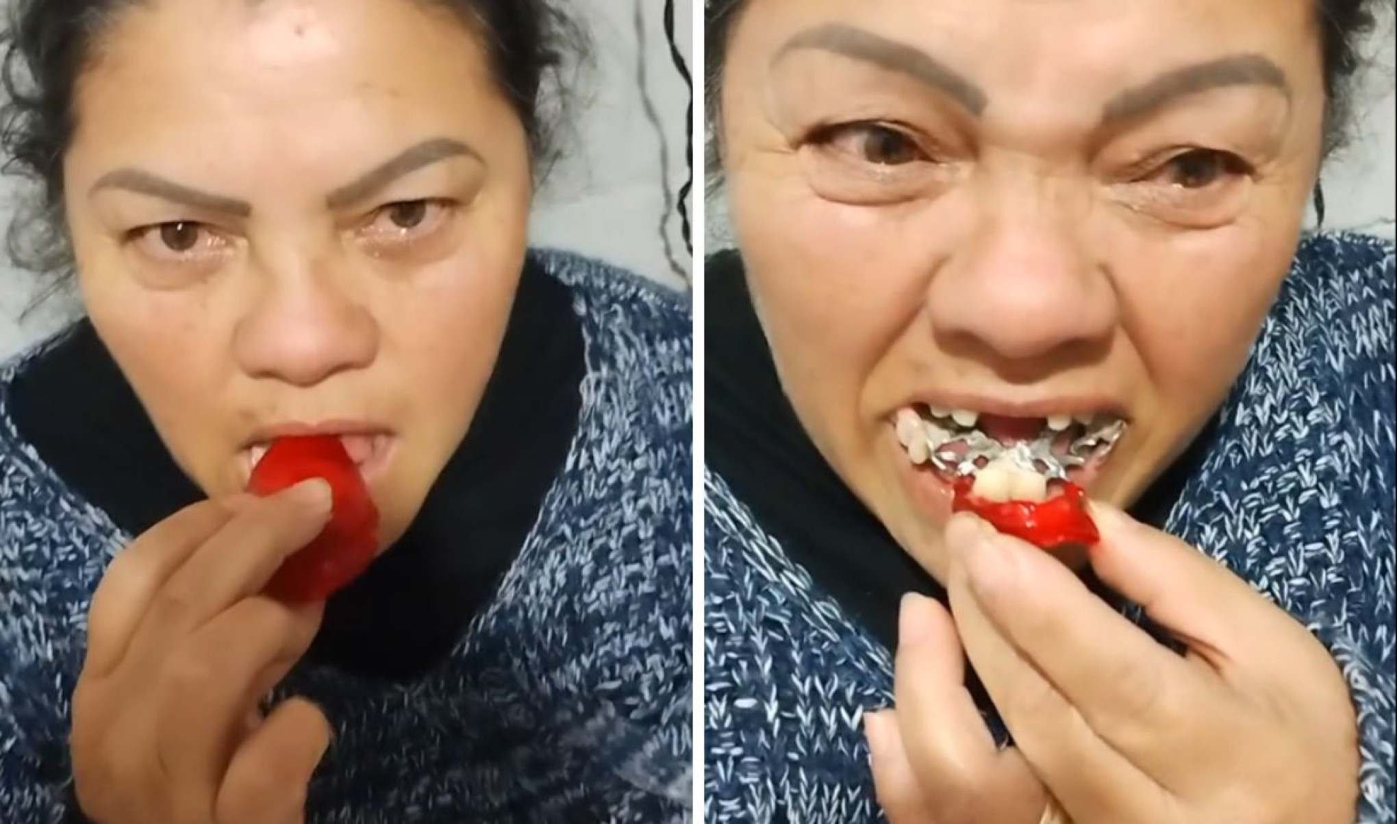 Morango do amor grudou na prótese dentária de mulher - (crédito: Reprodução / TikTok)