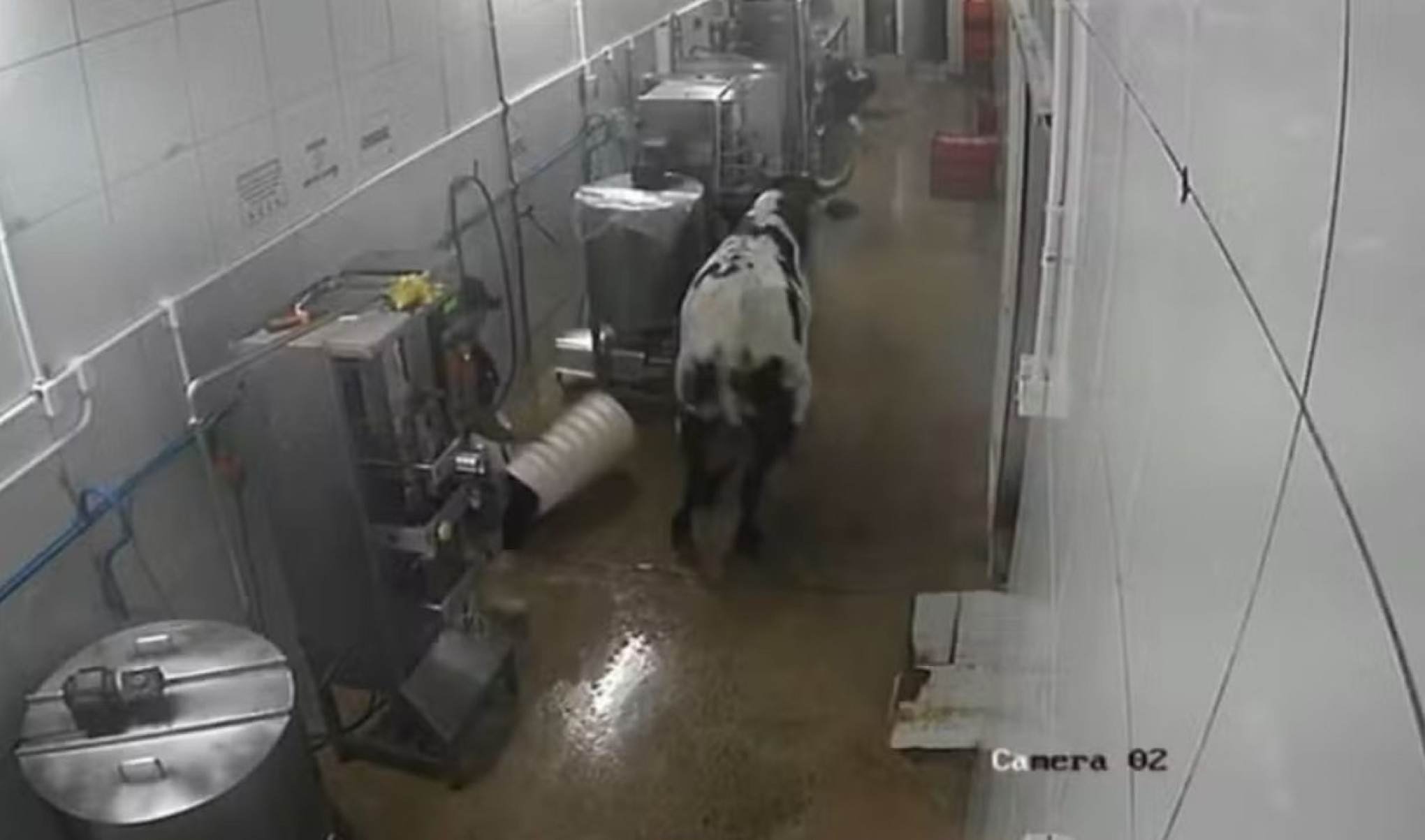 Em um dos registros, a vaca entra por uma porta e retorna em disparada, perseguindo outro funcionário e atingindo parte dos equipamentos da empresa com um coice.