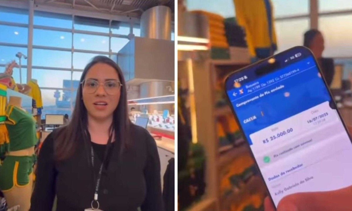A vendedora Kelly Gabriela viralizou nas redes sociais ao pedir demissão para receber um pix de R$ 25 mil. O benfeitor foi o influenciador digitalBuzeira, que possui quase 15 milhões de seguidores no Instagram. Ele ofereceu a quantia referente a um ano de salário da funcionária, para que ela deixasse o posto no Aeroporto de Guarulhos, em São Paulo.