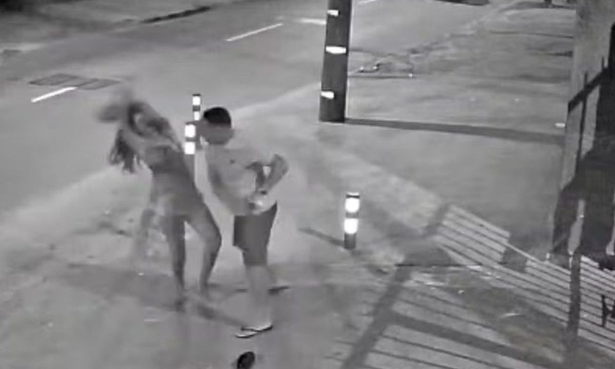 Nas cenas, o casal sai de um portão e, já na calçada, o agressor empurra a vítima no chão, levantando-a pelos cabelos. Em seguida, ele desfere socos no rosto da jovem e chutes enquanto ela está caída.