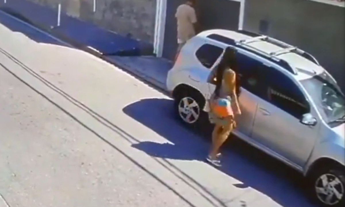 Imagens de câmeras de segurança mostram o momento em que um homem desce de um carro preto, dispara contra o veículo da vítima e foge em seguida.
