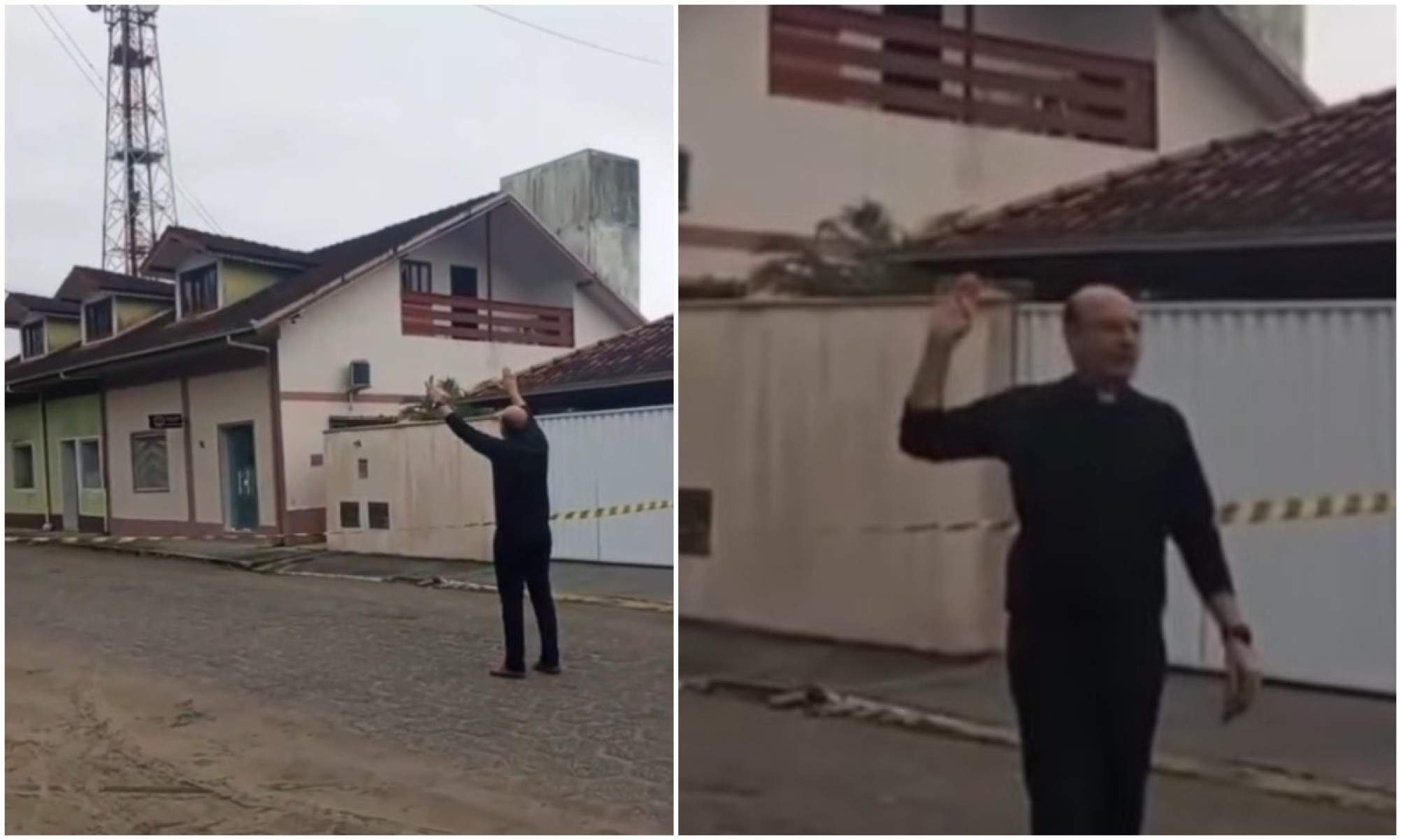 Um vídeo que circula na web mostra o padre Jackson Rampellotti em conversa com o jovem, que está no topo da torre. “A gente vai te ajudar, calma”, diz o religioso. “Você é padre? Vai me ajudar de que jeito?”, questiona o homem. “O que você quer?”, pergunta o sacerdote, que, em seguida, recebe a resposta: “Eu quero um beijo de língua seu”.