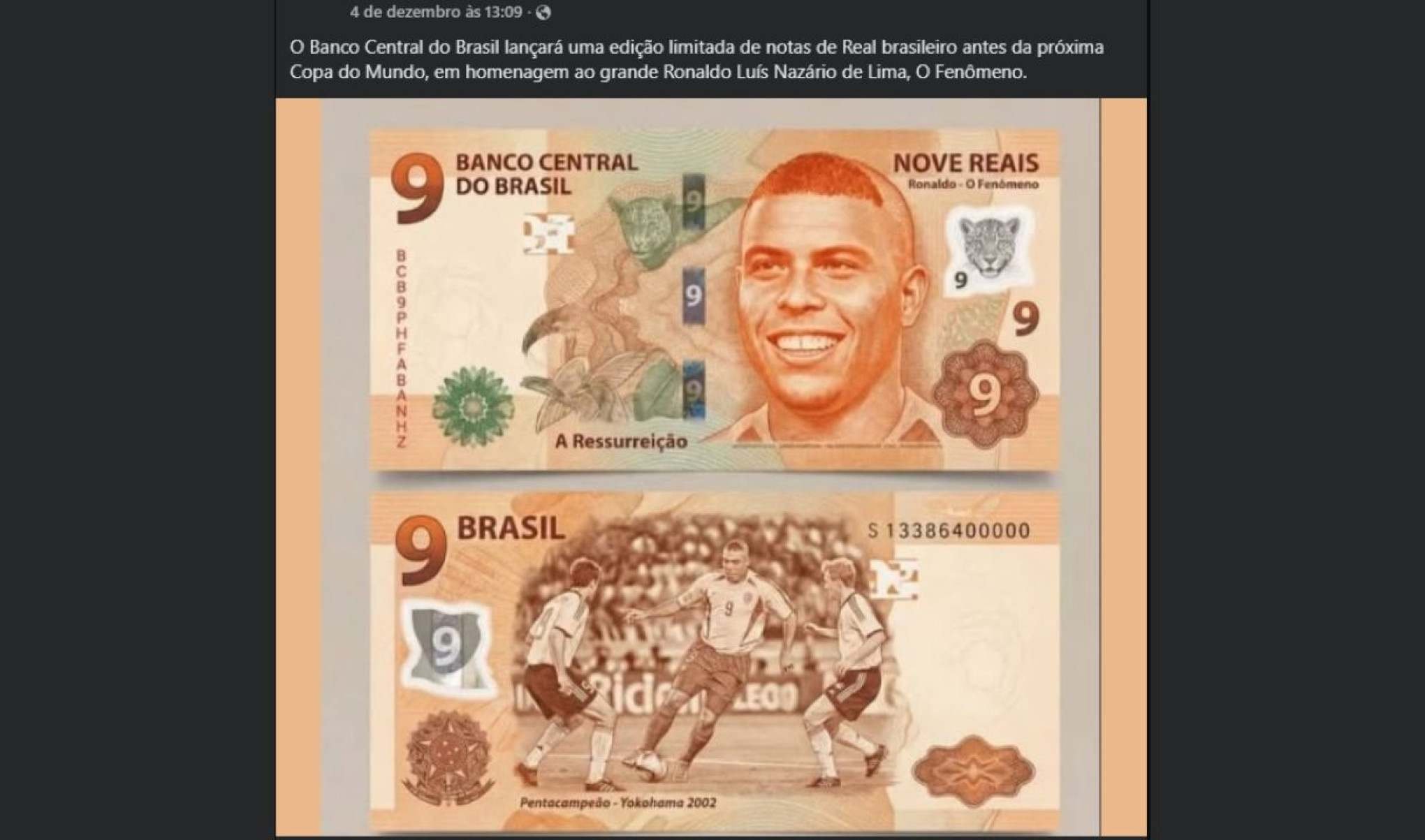 A imagem de uma cédula de Real, no valor de R$ 9 com o rosto estampado do jogador Ronaldo Fenômeno tem circulado nas redes sociais. A proposta, segundo as publicações, é homenagear o craque em decorrência da Copa de 2026. Mas tudo não passa de uma fake news.