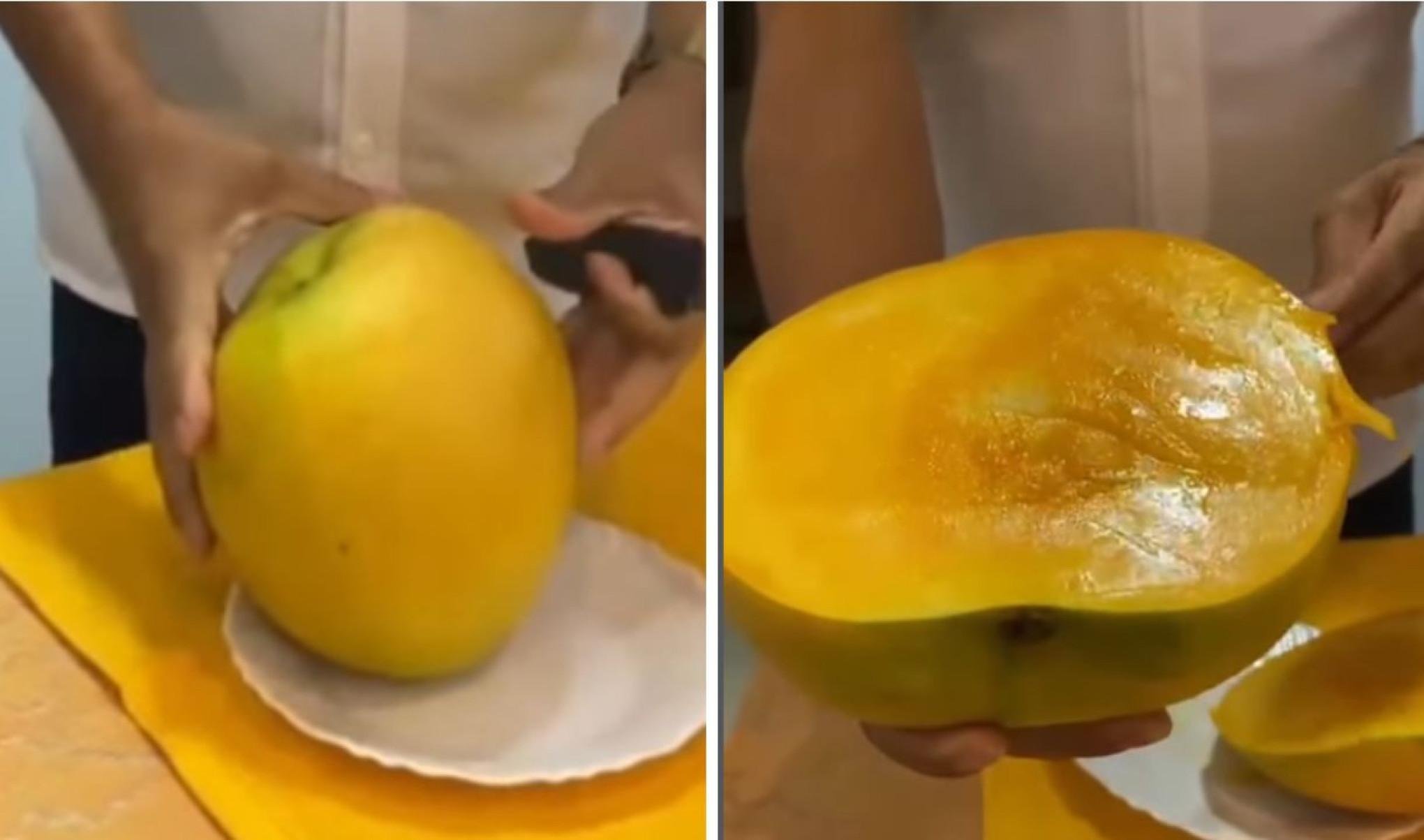 Uma mangagigante viralizou nas redes sociais. A fruta, que pesa 2,083 kg, foi colhida em Cascavel (CE) no último dia 9 de janeiro e rendeu porções para 10 pessoas.